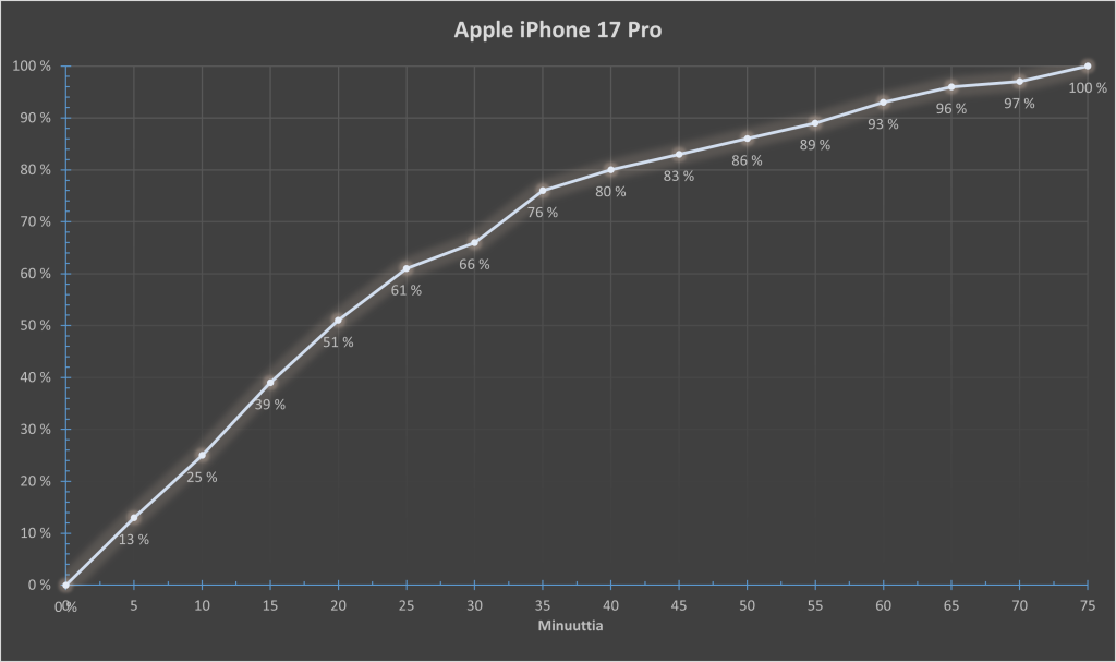 Oman lataustestini perusteella iPhone 17 Pro käyttäytyy erittäin johdonmukaisesti. Tulokset ovat esillä alapuolella olevassa kuvaajassa.