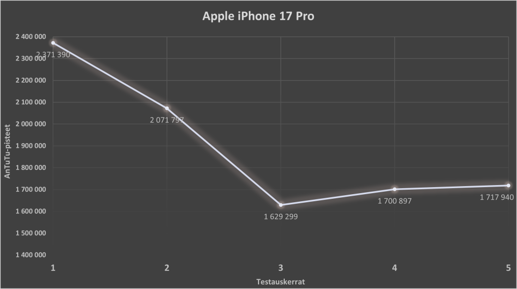 Iphone 17 Prolle tehtiin myös AnTuTu-pohjainen stressitesti, jossa testi ajettiin viisi kertaa peräkkäin. Ensimmäinen ajo tuotti parhaan tuloksen 2 371 390 pistettä, minkä jälkeen suorituskyky laski toisella kierroksella 2 071 797 pisteeseen ja kolmannella kierroksella alimmilleen 1 629 299 pisteeseen. Neljännellä ja viidennellä kierroksella suorituskyky nousi hieman takaisin, ollen lopulta 1 717 940 pistettä.