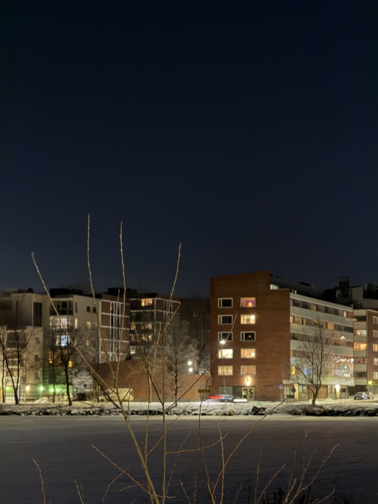 Hämärässä iPhone 17 Pro toimii erinomaisesti. Automaattinen yötila aktivoituu selvästi harvemmin kuin iPhone Airissa, mikä mahdollistaa 24 megapikselin kuvaamisen myös heikommassa valaistuksessa. Täydessä pimeydessä yötila on edelleen tarpeen, mutta useimmissa iltakuvaustilanteissa kamera pärjää ilman sitä. Kuvissa on hieman rakeisuutta varjoalueilla, mutta yksityiskohdat säilyvät hyvin, dynamiikka on laaja ja värintoisto pysyy luotettavana.