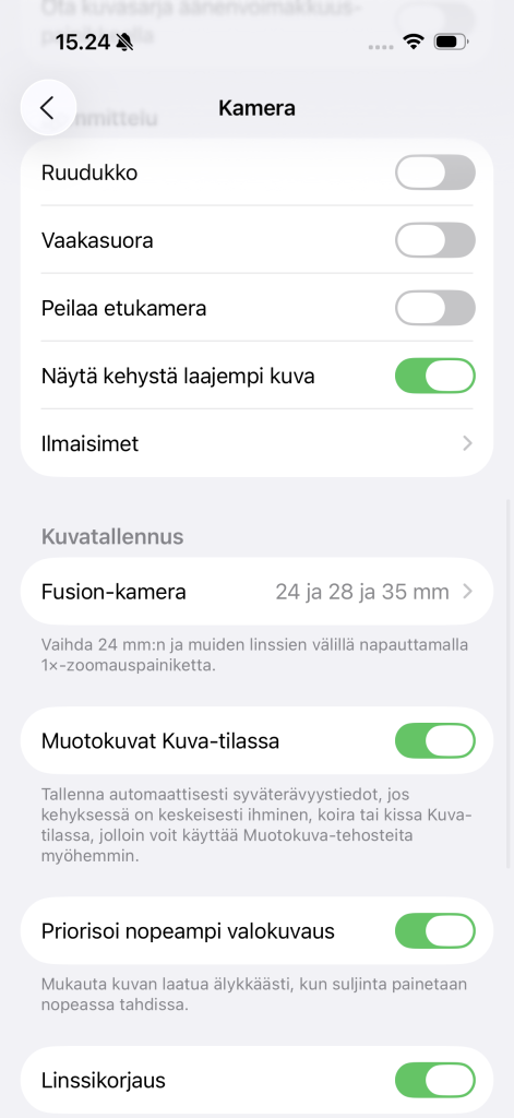 Useista muutoksista huolimatta Applen kamerasovelluksen yksi perinteinen heikkous on edelleen läsnä, ja se on asetusten hajanaisuus. Vaikka osa resoluutio- ja ruutunopeusvalinnoista on nyt tuotavissa esiin suoraan kamerasovellukseen, monet edistyneemmät asetukset löytyvät yhä puhelimen yleisistä asetuksista useiden valikoiden takaa. Esimerkiksi kuvan tarkempien resoluutiovalintojen hallinta ei ole suoraviivaista, ja kokonaisuus tuntuu paikoin tarpeettoman monimutkaiselta.