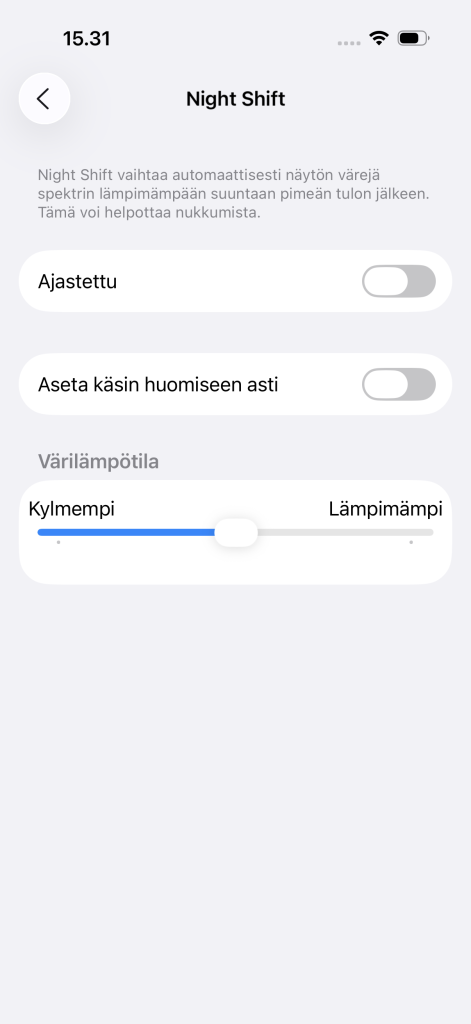 Värintoisto on Applen tuttua, erittäin luonnollista linjaa. True Tone säätää värilämpötilaa ympäristön mukaan, ja HDR10- sekä Dolby Vision -tuki takaavat laadukkaan kokemuksen suoratoistopalveluissa. Musta on OLED-paneelille tyypillisesti syvää ja kontrasti erinomainen. Lisäksi näyttö kykenee erittäin matalaan minimikirkkauteen, mikä tekee pimeässä käytöstä miellyttävää eikä rasita silmiä.