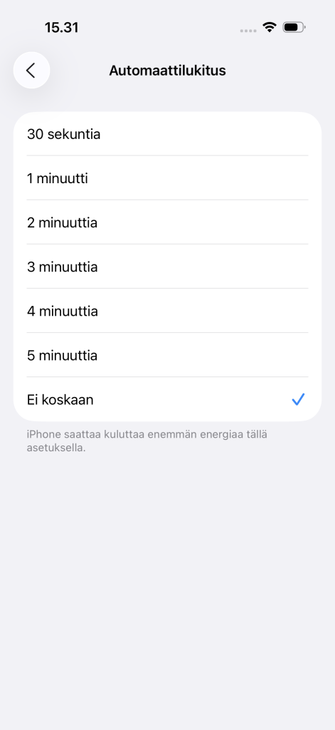 Käytännössä tämä tarkoittaa, että lyhytkin lataus riittää pitkälle. Vartin pikalataus tuo jo lähes 40 prosenttia akkua, ja puolen tunnin latauksella iPhone 17 Pro on valmiina useiksi tunneiksi vaativampaakin käyttöä. Täyteen lataaminen on selvästi nopeampaa kuin aiemmissa iPhone Pro -malleissa ja myös merkittävä parannus iPhone Airiin verrattuna.