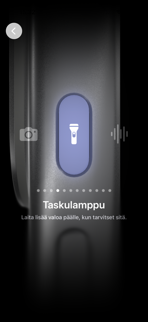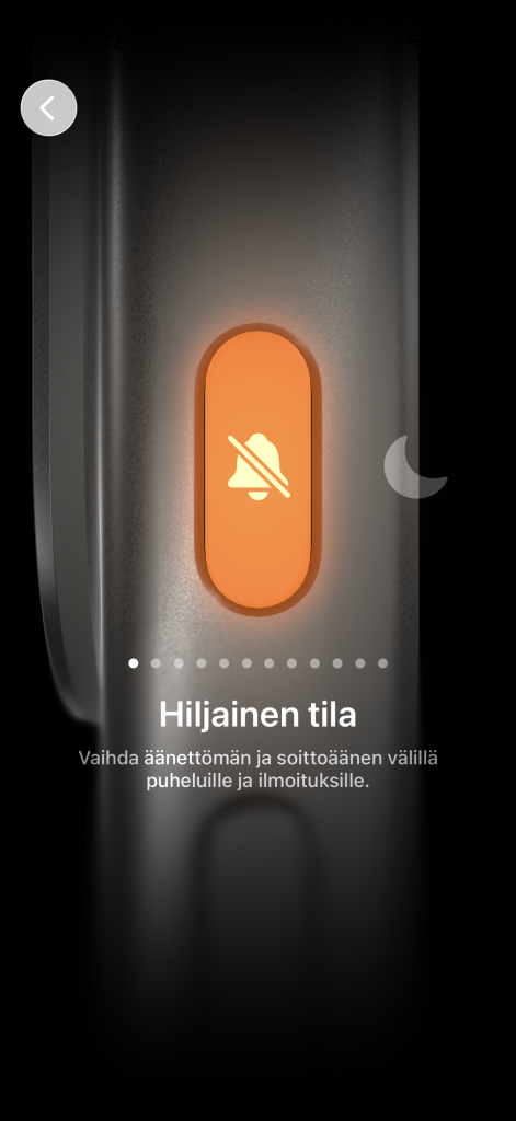 Oletusarvoisesti Toimintopainike toimii mykistyspainikkeena, joka laittaa puhelimen Hiljaiseen tilaan. Painikkeen asetuksista voit vaihtaa painikkeeseen myös eri toiminnallisuuksia, kuten vaihtamisen keskity-tilaan, kameraan, taskulamppuun, saneluun, suurennuslasiin, erilaisiin pikakomentoihin tai käyttöapuun. Painikkeen kaikki toiminnot saa myös kokonaan pois päältä.