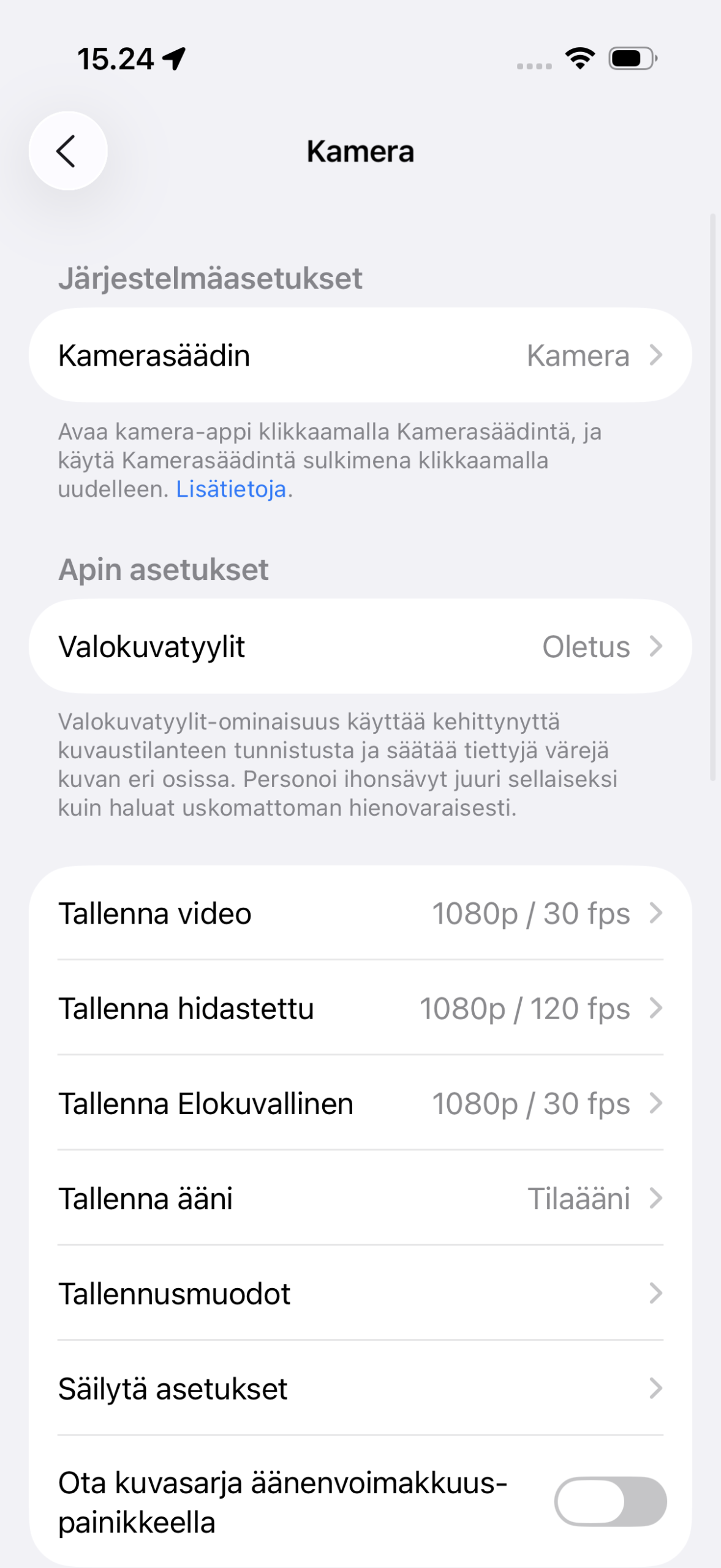 Useista muutoksista huolimatta Applen kamerasovelluksen yksi perinteinen heikkous on edelleen läsnä, ja se on asetusten hajanaisuus. Vaikka osa resoluutio- ja ruutunopeusvalinnoista on nyt tuotavissa esiin suoraan kamerasovellukseen, monet edistyneemmät asetukset löytyvät yhä puhelimen yleisistä asetuksista useiden valikoiden takaa. Esimerkiksi kuvan tarkempien resoluutiovalintojen hallinta ei ole suoraviivaista, ja kokonaisuus tuntuu paikoin tarpeettoman monimutkaiselta.