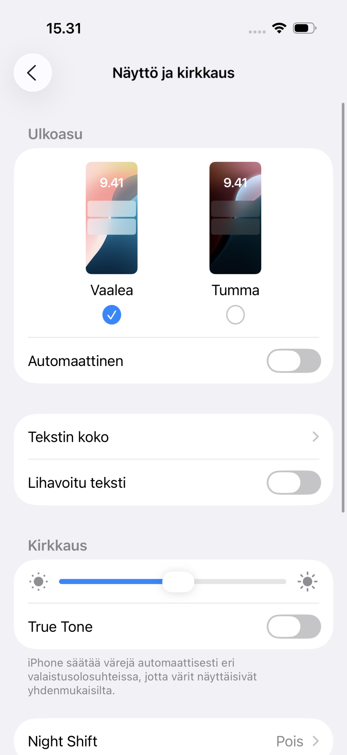 ProMotion toimii iPhone 17 Prossa juuri kuten aiemminkin. Virkistystaajuus mukautuu automaattisesti käytön mukaan, eikä käyttäjällä ole varsinaisia säätömahdollisuuksia, pois lukien mahdollisuus rajoittaa näyttö 60 hertsiin. Arjessa käyttö on kuitenkin sulavaa, ja animaatiot sekä vieritys tuntuvat erittäin pehmeiltä.