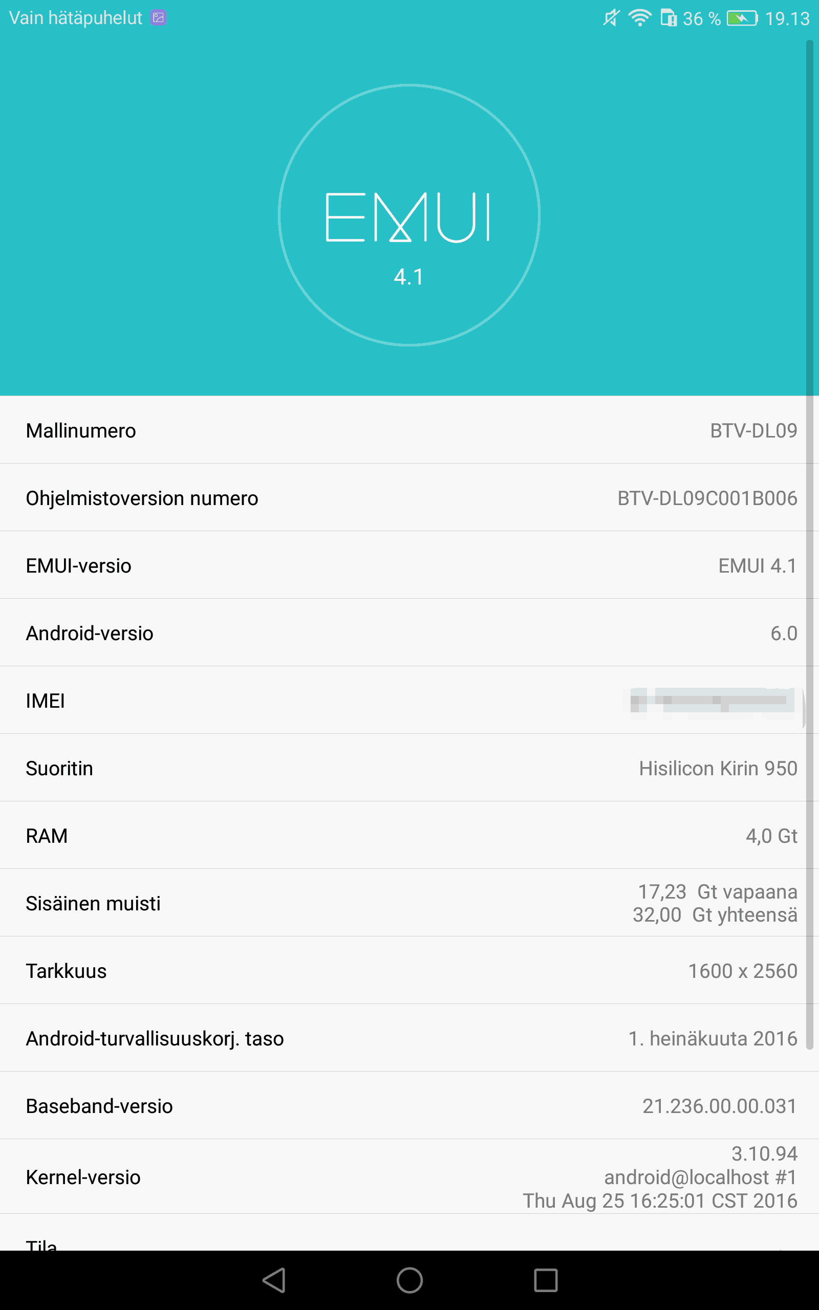 Teknisesti Huawei MediaPad M3 on vahvalla pohjalla. Tabletissa käytetään luonnollisesti Huawein omaa kahdeksanytimistä HiSilicon Kirin 950 -järjestelmäpiiriä, joka rakentuu neljästä 1,8 GHz:n taajuudella hyrräävästä Cortex-A53-ytimestä sekä neljästä 2,3 GHz:n taajuudella toimivasta Cortex-A72-ytimestä. Grafiikkasuorittimena tabletissa toimii Mali-T880 MP4. Tabletissa on myös 4 gigatavua RAM-muistia mallista riippumatta. MediaPad M3 on siis teknisesti aivan Mate 8 -puhelimen tasolla, joka julkaistiin vuoden 2015 lopulla Kiinassa ja saapui vasta vuonna 2016 maailmalla myyntiin. Tabletissa on mielestäni edelleen varsin pätevää tekniikkaa, sillä myös Mate 8 on vielä tänä päivänäkin loistava puhelin.