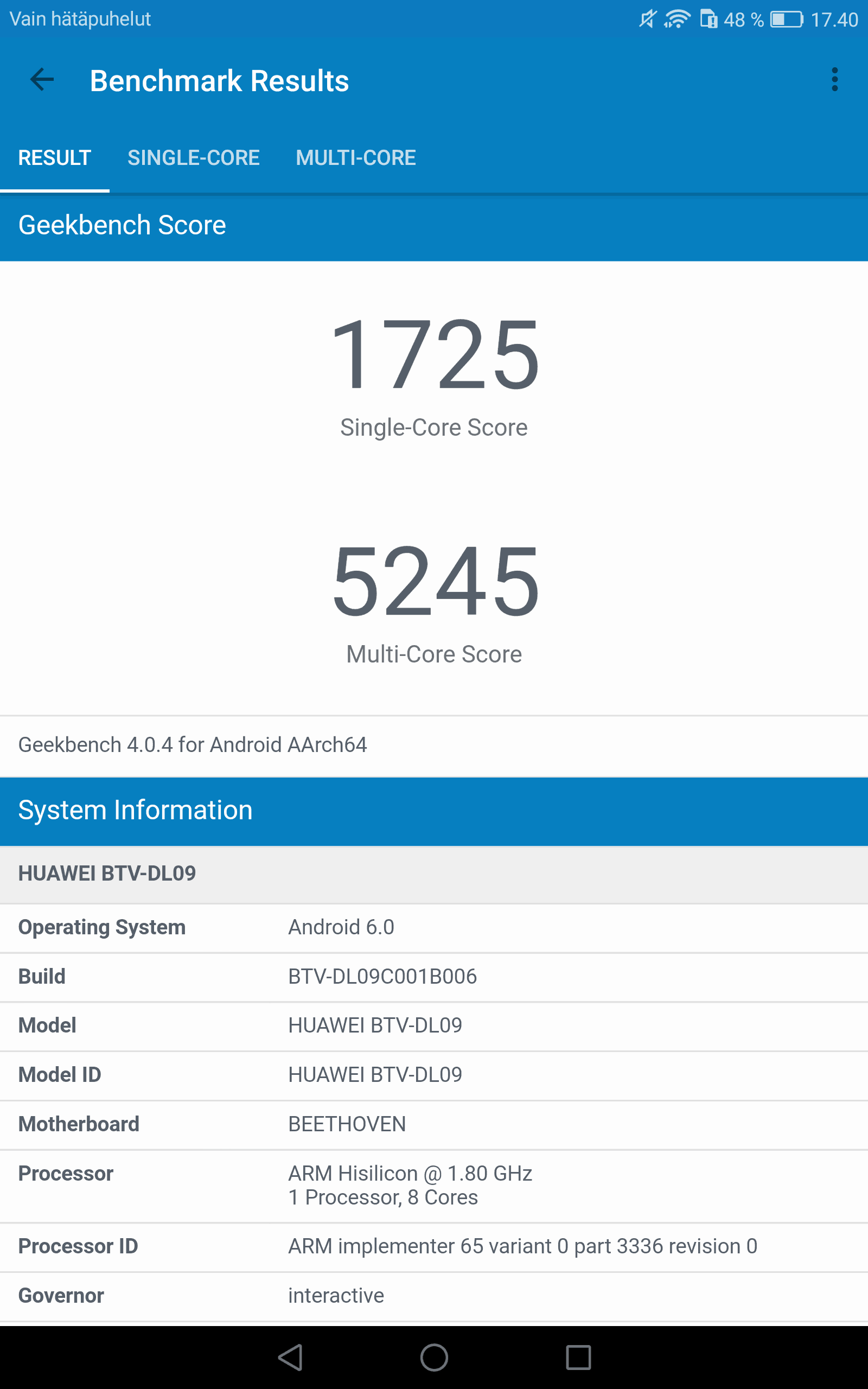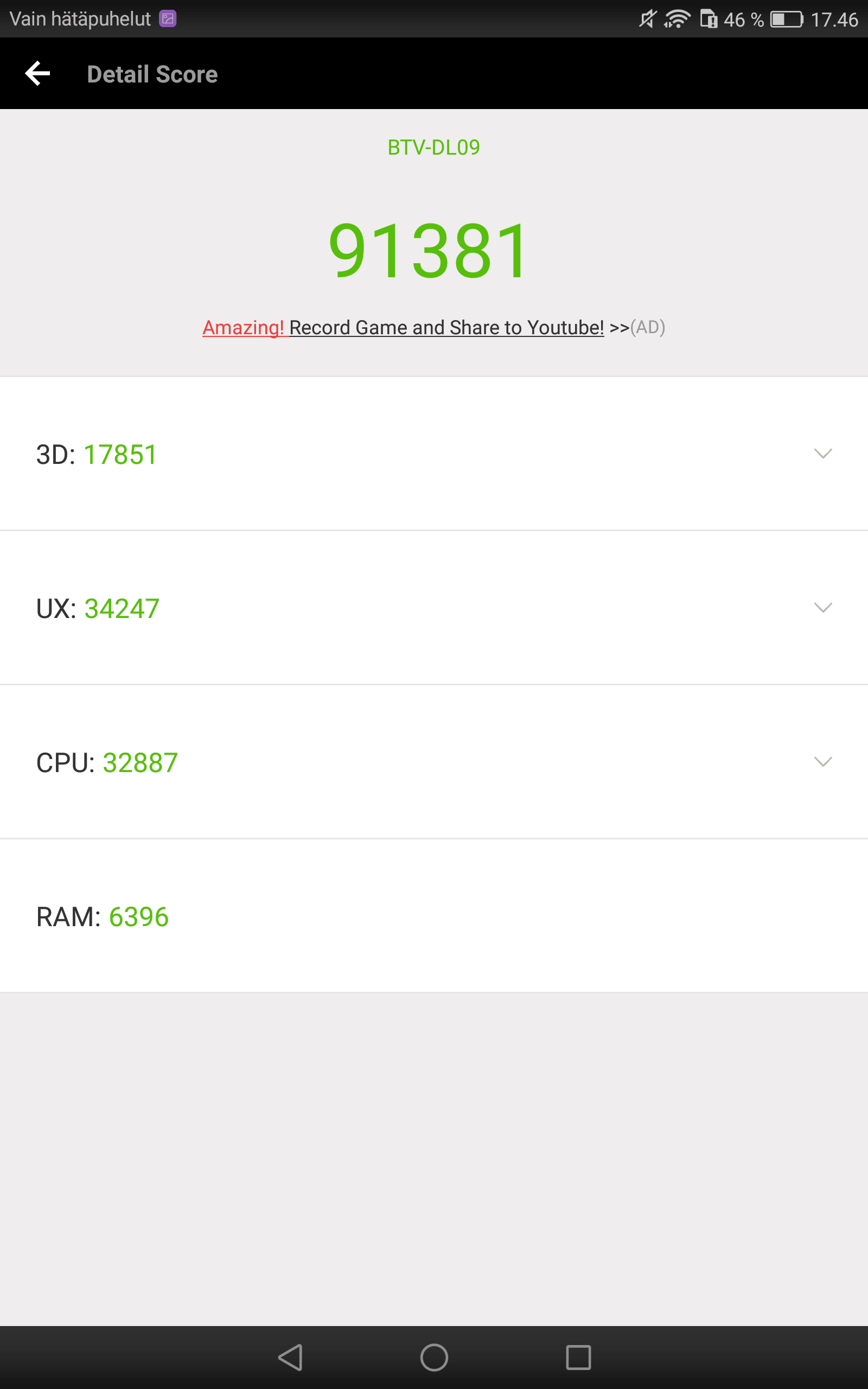 Suorituskykymittauksissa Huawei MediaPad M3 pärjää hyvin, vaikka se ei pääse viime vuoden lippulaivapuhelimien tasolle, mutta viihdekäyttöön tarkoitetussa Android-tabletissa tuskin vastaavia tehoja tarvitaan. Ajoimme tabletissa läpi Geekbench 4 ja AnTuTu -suorituskykytestit, jotka antoivat kohtuullisen hyvät tulokset. AnTuTu antoi tabletille 91 381 pistettä, joka ei ole kuitenkaan lähellekään tuoreimpia lippulaivapuhelimia, jotka yltävät yli 160 000 pisteeseen.