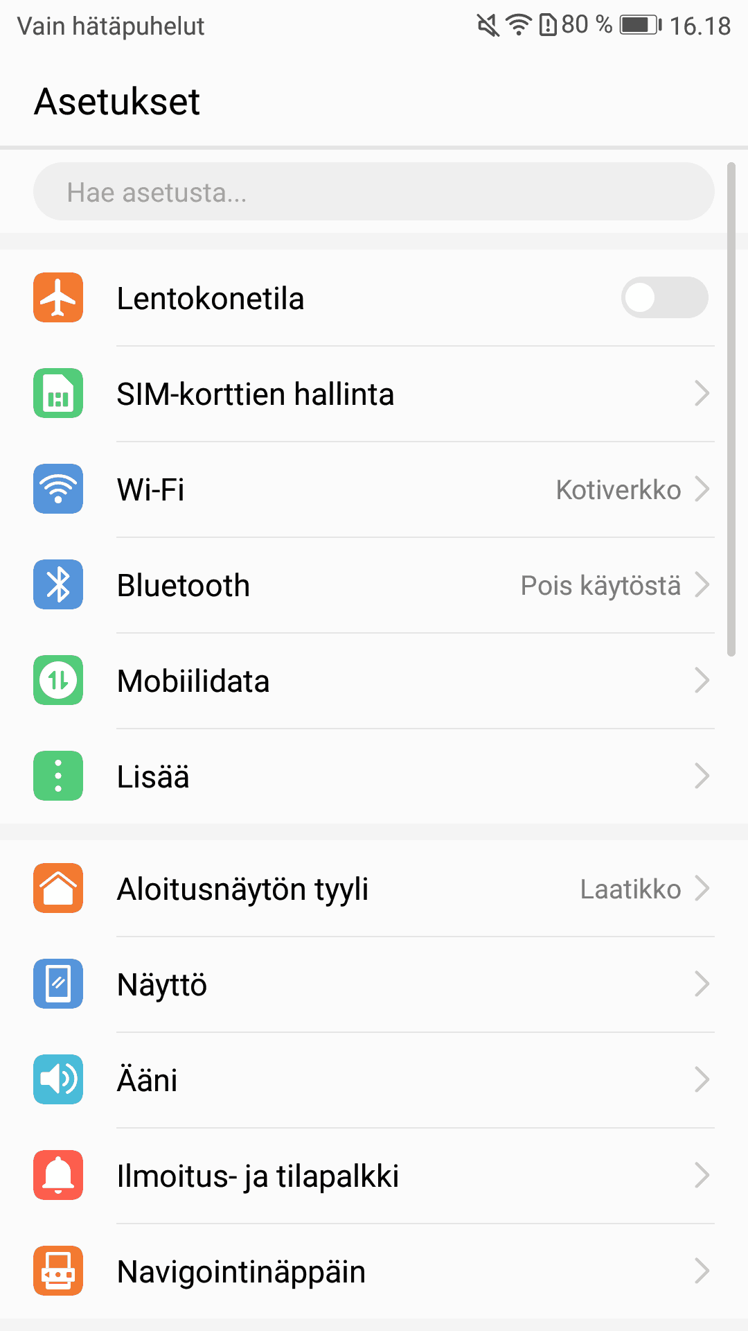 EMUI 5:n mukana myös asetukset ovat saaneet uuden ilmeen. Nyt asetuksissa on muun muassa helpompi ja nopeampi liikkua uuden valikon ansiosta. Aikaisemmin EMUI 4.1 -versiossa piti aina palata yksi askel taaksepäin, että sai avattua seuraavan asetuksen. EMUI 5:n kohdalla vasemmasta sivusta saa auki valikon, josta voi helposti valita seuraavan välilehden asetuksista. Asetukset ovat saaneet myös uutta ilmettä ja nyt ainakin allekirjoittaneen mielestä asetukset ovat helppokäyttöisemmät sekä tyylikkäämmät.