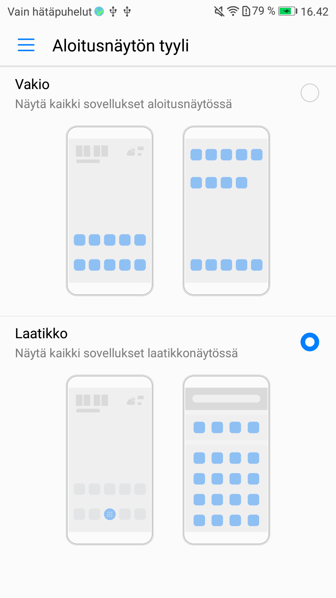 Huawei on vihdoin alkanut kuunnella käyttäjiensä palautetta, joka näkyy erityisesti EMUI 5:n käyttöliittymässä. Esimerkiksi EMUI 4.1 -version kohdalla käyttäjiä ärsytti erityisesti Huawein aggressiivinen tapa muokata normaalin Androidin peruspilareita, sillä esimerkiksi aikaisemmin Huawein puhelimista ei ole löytynyt erillistä sovellusvalikkoa. Myöskään EMUI 5:n kohdalla sovellusvalikkoa ei ole vakiona käytössä, mutta Huawei kuitenkin antaa siihen mahdollisuuden. Erillinen sovellusvalikko on mahdollista nyt asettaa päälle asetuksista ja tämä mahdollisuus on varmasti monelle mieleinen. Ainakin henkilökohtaisesti asetin heti testijakson aluksi sovellusvalikon päälle.