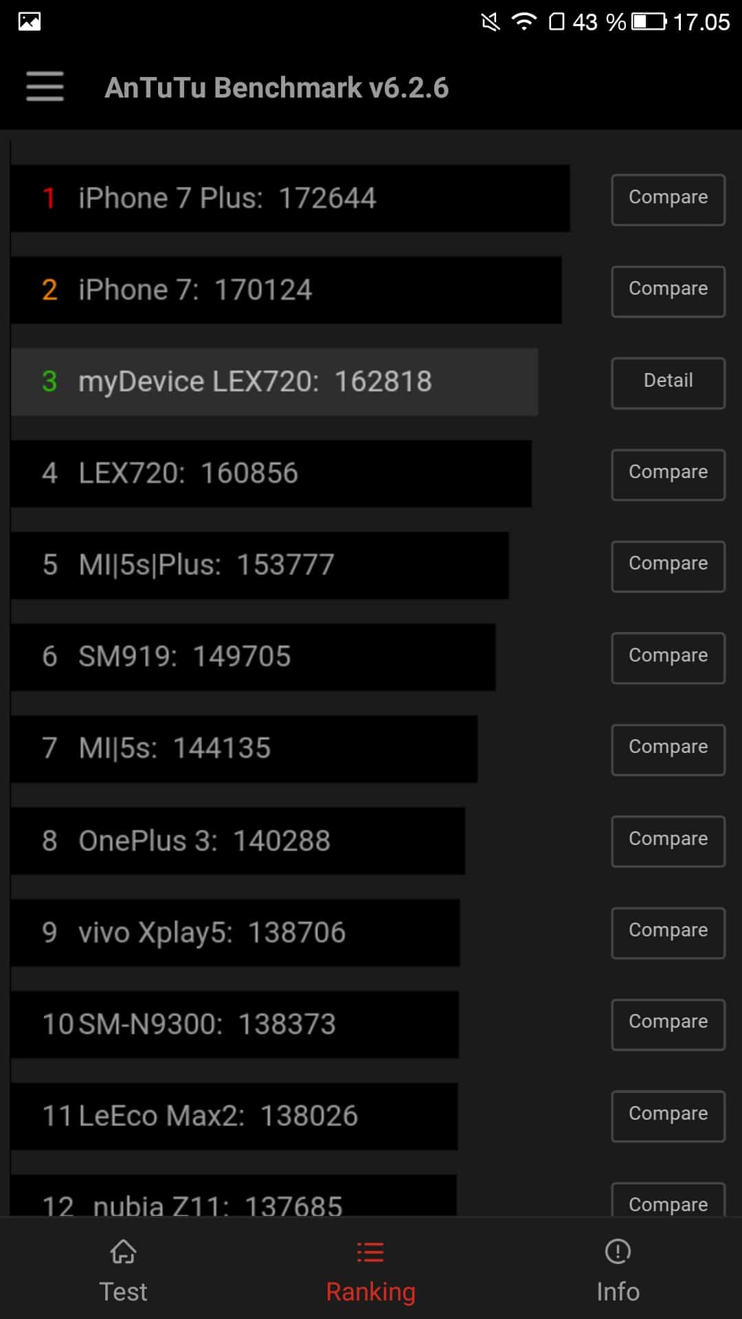 Arvostelun kirjoitushetkellä LeEco Le Pro 3 oli tehokkain Android-puhelin. Tarkistin silloin myös OnePlus 3T:n AnTuTun tulokset ja lukemaksi tuli vain 153 754. Toki tilanne on voinut muuttua päivityksien myötä.