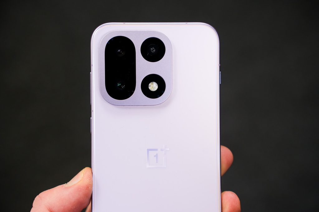 Takaosan muotoilulta OnePlus 15 on jotain muuta kuin aikaisemmin. Katseet kiinnittyvät nyt neliömäiseen kamera-alueeseen, joka ulkonee hieman muusta rungosta. Kameroita siinä on kolme kappaletta ja mukana on myös LED-salamavalo. Puhelimen takaosassa on myös OnePlussan logo hieman normaalia korkeammalla sekä alareunaan on saatu muita vaadittuja merkintöjä.
