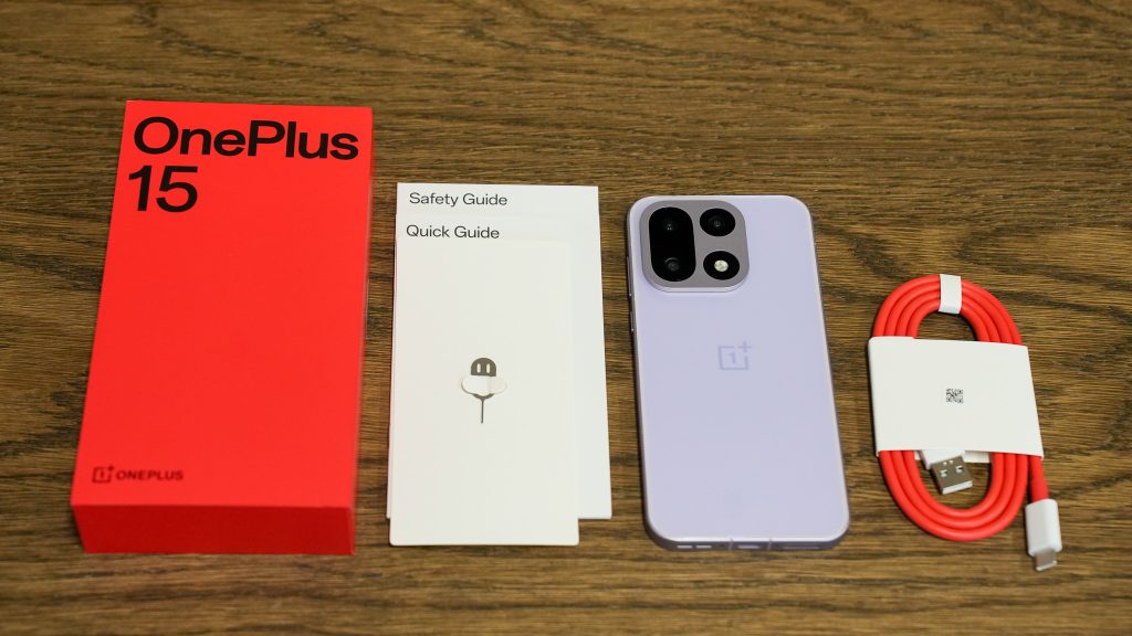 Myyntipakkausta avatessa ensimmäisenä esille tulee musta pahvitasku, joka pitää sisällään SIM-korttiluukun avaustyökalun, pikakäyttöoppaan, turvallisuustietoja sekä USB-piuhan (USB-A > USB-C). Tämän jälkeen myyntipakkauksesta tulee esille OnePlus 15 paperiin käärittynä. Mitään muuta ei paketin mukana tule. Laturia ei siis mukana ole.