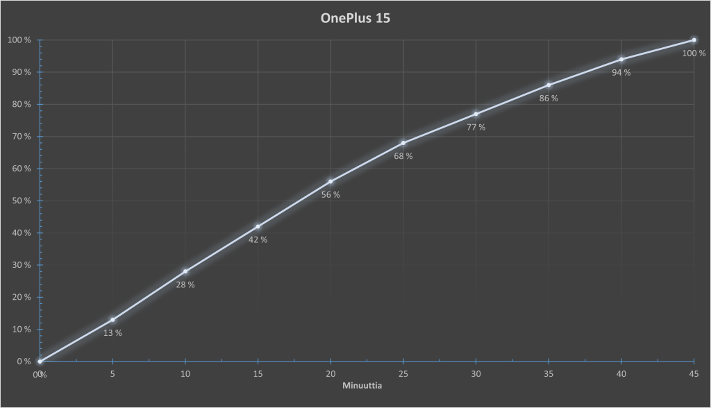 120 watin langallisella pikalatauksella akku latautuu valmistajan omien mittauksien mukaan tyhjästä täyteen noin 39 minuutissa. OnePlussan tiedot ovat lähellä omia mittauksiani, sillä tekemäsi lataustestin perusteella OnePlus 15 nousi 0-100 % tasolle noin 45 minuutissa. Lataustestin tulokset ovat nähtävillä alapuolen kuvaajasta.