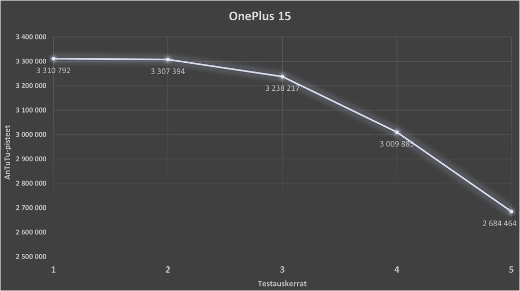 Parhaan ja heikoimman tuloksen välinen ero on näin ollen noin 626 000 pistettä, eli laskua kertyy jopa -18,9 %. Tämä on suurempi lasku kuin OnePlus 13:lla, jonka vastaava pudotus oli noin 15,35 %. Suorituskyvyn aleneva kaari on siis nähtävissä myös OnePlus 15:ssä, mutta testin perusteella pudotus tapahtuu vasta testin loppupuolella.