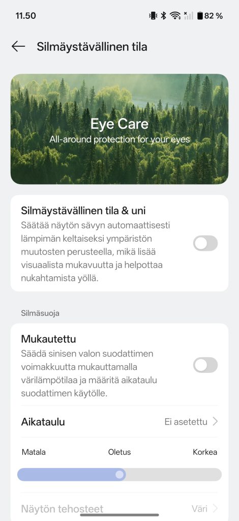 Myös OnePlus 15 -puhelimessa on panostettu silmäystävällisiin tekniikoihin päivitetyllä 2160 hertsin PWM-himmennyksellä. Se vähentää silmiin kohdistuvaa rasitusta erityisesti heikossa valaistuksessa, mikä on hyväksi silmille erityisesti ennen nukkumaanmenoa. Lisäksi silmäystävällisessä tilassa puhelin osaa automaattisesti säätää näytön värejä keltaisemmaksi sinisen valon minimoimiseksi. Yksi uudistus on myös näytön 1 nitin minimikirkkaus, joka osaltaan parantaa käytettävyyttä pimeässä.