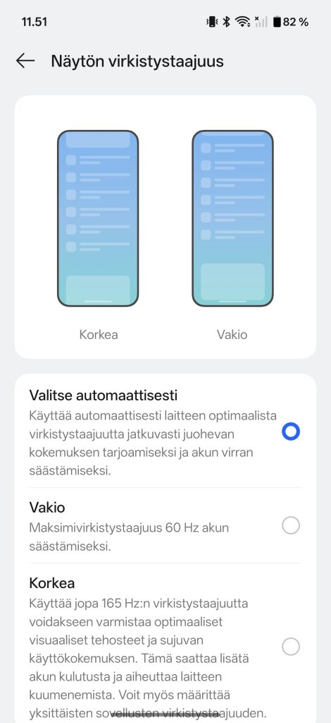 Näytön virkistystaajuutta on mahdollista vaihtaa 60 tai 165 hertsin välillä, joten esimerkiksi 90 tai 120 hertsin virkistystaajuus ei ole erikseen vaihtoehto. Automaattisessa tilassa puhelin optimoi virkistystaajuuden itse.