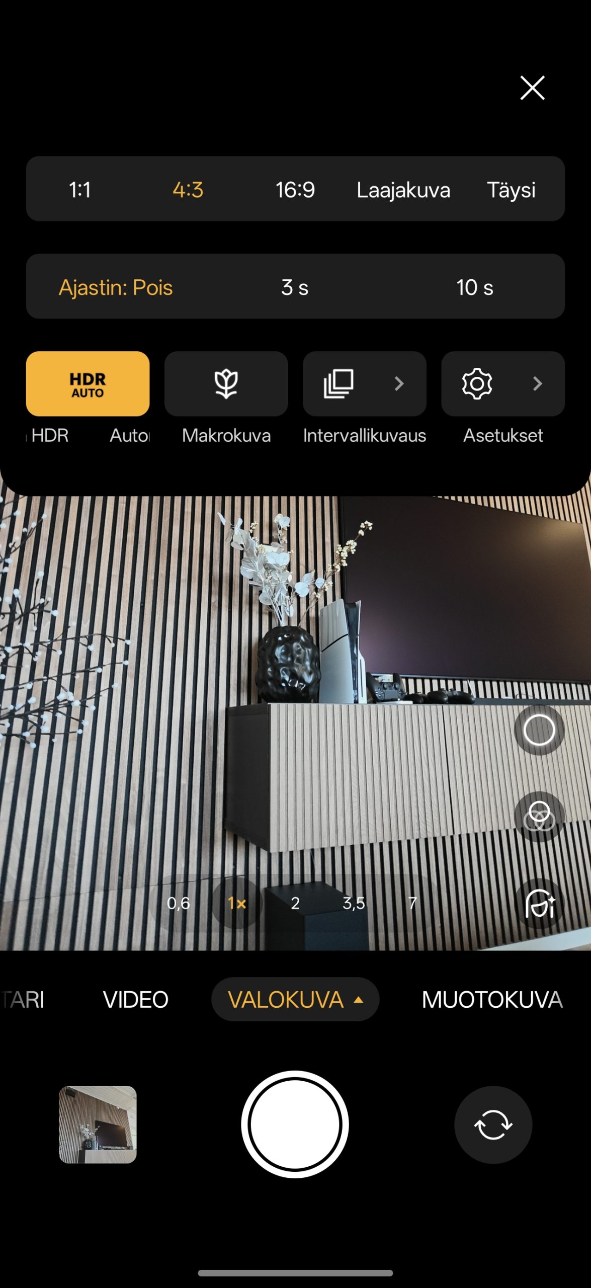 Kamerasovelluksen tärkeimmät toiminnot ovat helposti saavutettavissa. Yläreunan pikapainikkeista saa hallittua muun muassa salamaa, valotusta, live-kuvaa, toimintatilaa, Google Lens -integraatiota sekä valikkopainiketta. Valikon kautta löytyy asetuksia kuvasuhteelle, ajastukselle, HDR-tilalle, makrolle ja intervallikuvaukselle, ja sieltä pääsee myös syvemmälle kameran asetuksiin.