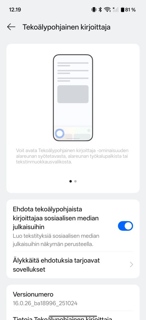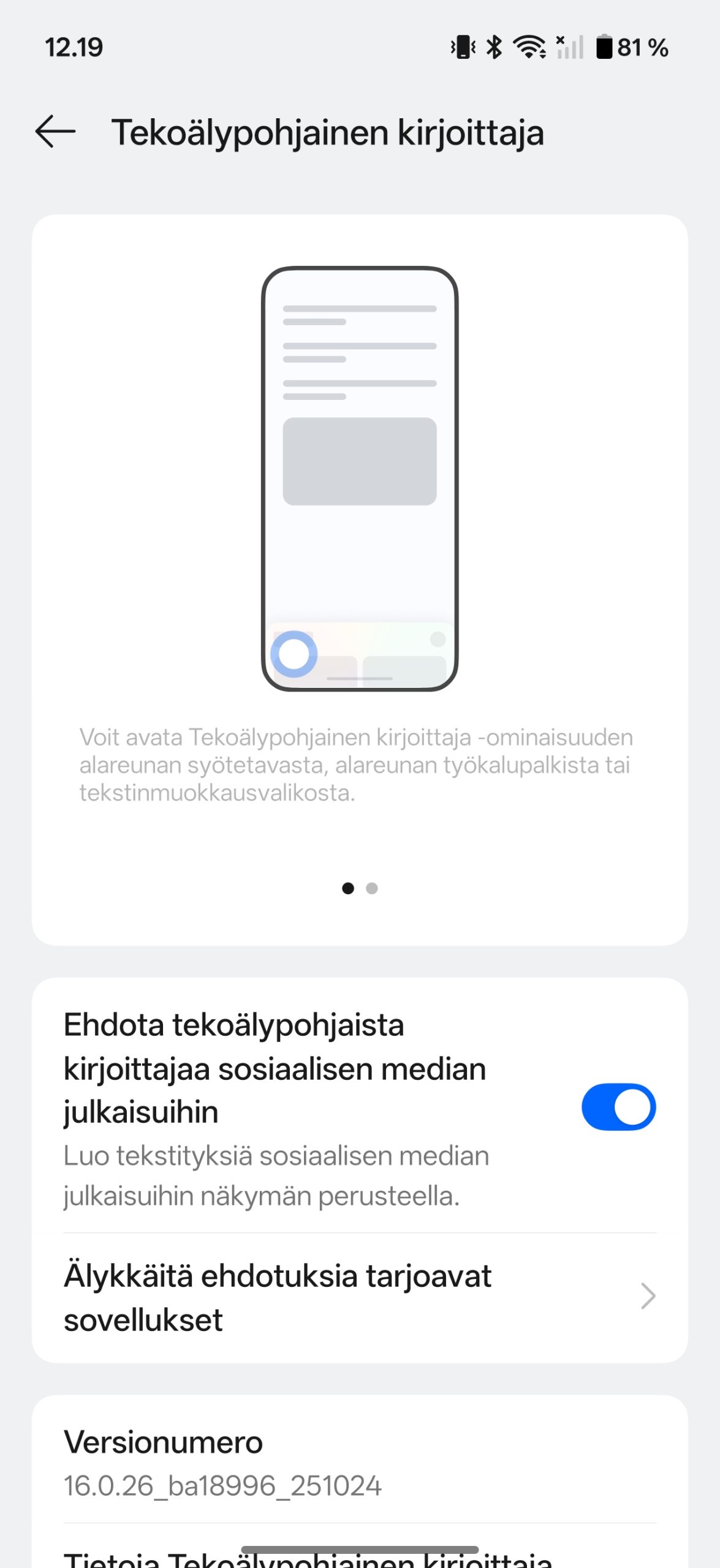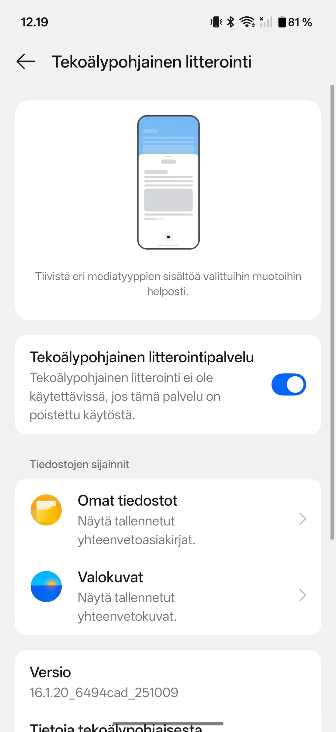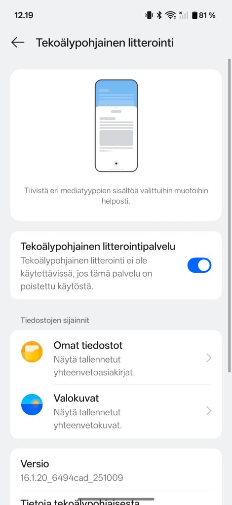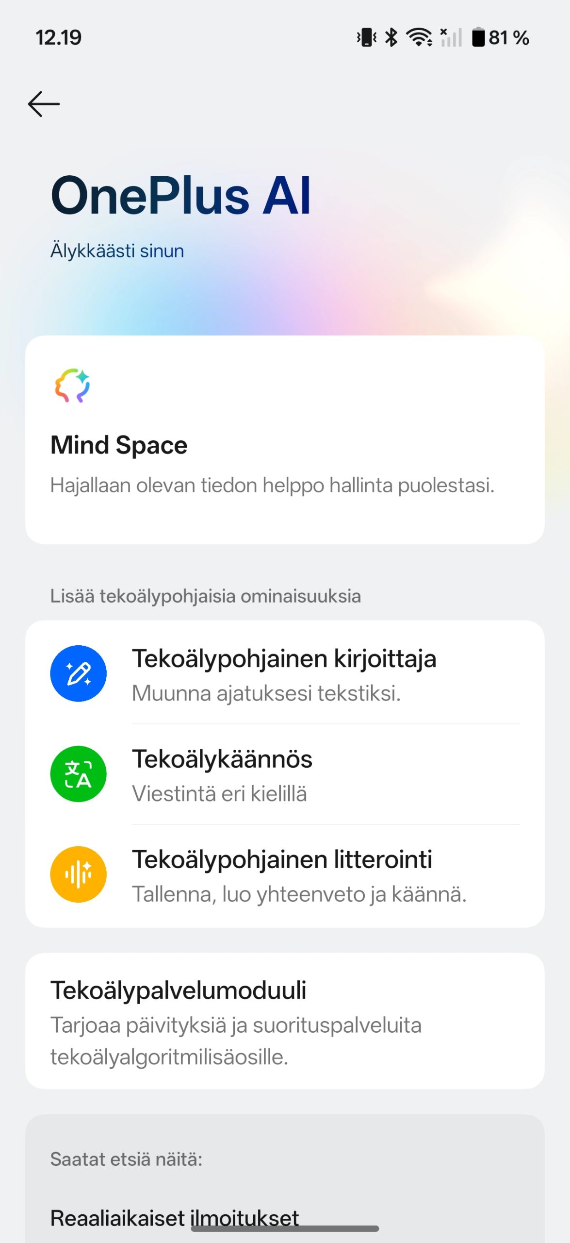 Tällä kertaa OnePlus on panostanut erityisesti tekoälyyn, joka näkyy lähes jokaisessa sovelluksessa. Merkittävin uudistus on Plus Mind -ominaisuus, joka toimii eräänlaisena älykkäänä muistikerroksena käyttöliittymän sisällä. Kun ruudulta haluaa tallentaa asioita myöhempää käyttöä varten, erillistä kuvakaappausta ei tarvita, vaan Plus Mind tulkitsee sisällön automaattisesti ja järjestää sen selkeäksi kokonaisuudeksi.