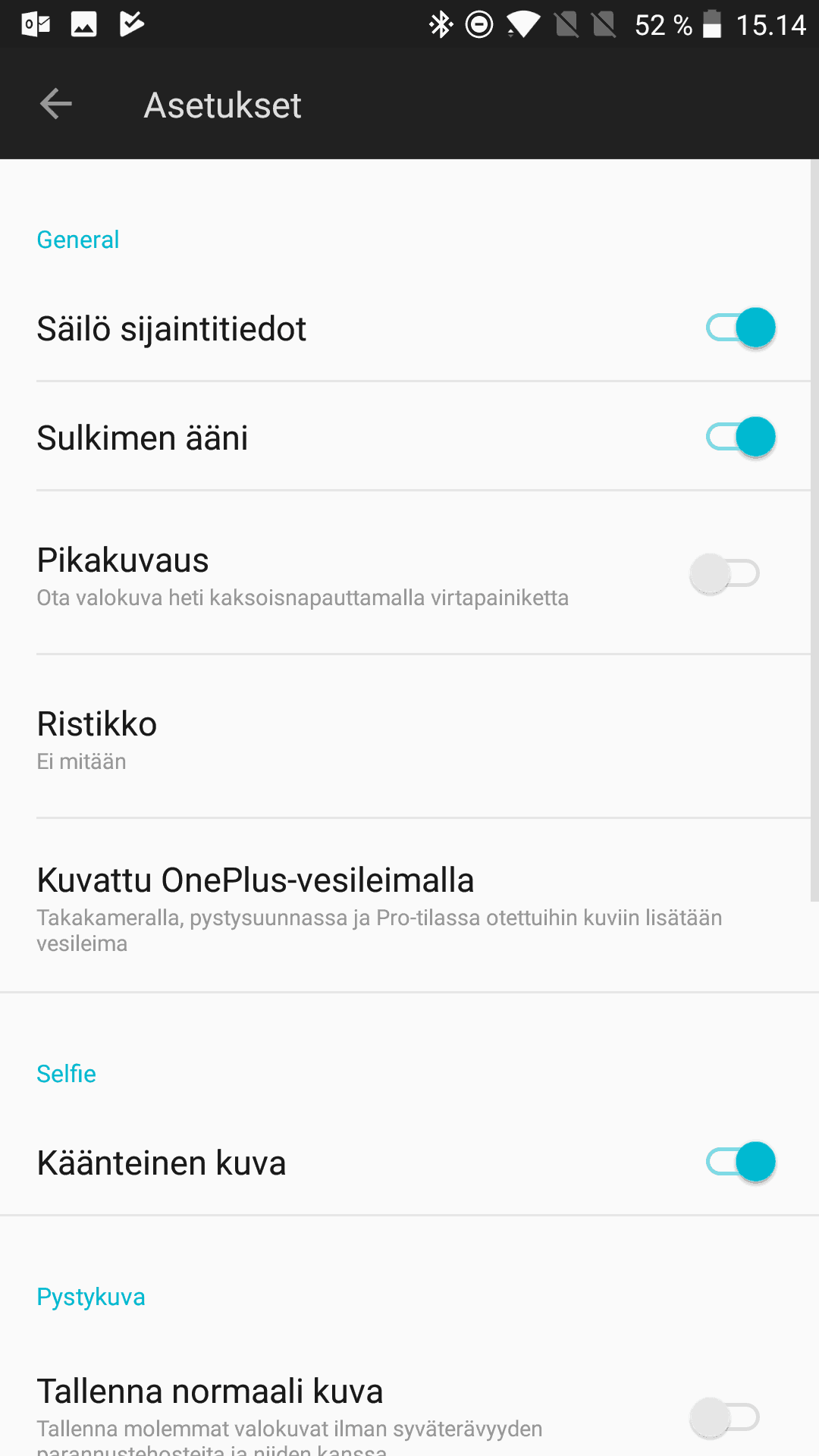 OnePlussan oma vakiokamerasovellus on luultavasti yksi parhaimmista ja sellainen, josta ei ole juurikaan pahaa sanottavaa. Kamerasovellus on heti avatessa käytettävissä, eikä sovelluksen käytössä ollut havaittavissa mitään ongelmia tai bugeja. Erityisen yllättynyt olen OnePlus 5:n Pro-kuvaustilasta, joka on varsin kattava. Pro-tilassa voi säätää esimerkiksi ISO-arvoa, suljinaikaa, tarkennusta sekä valaistusta, joiden lisäksi tarjotaan vakiona myös histogrammia, sommitteluviivoja sekä vesivaakaa, joiden avulla kuvan saa aseteltua juuri oikein.
