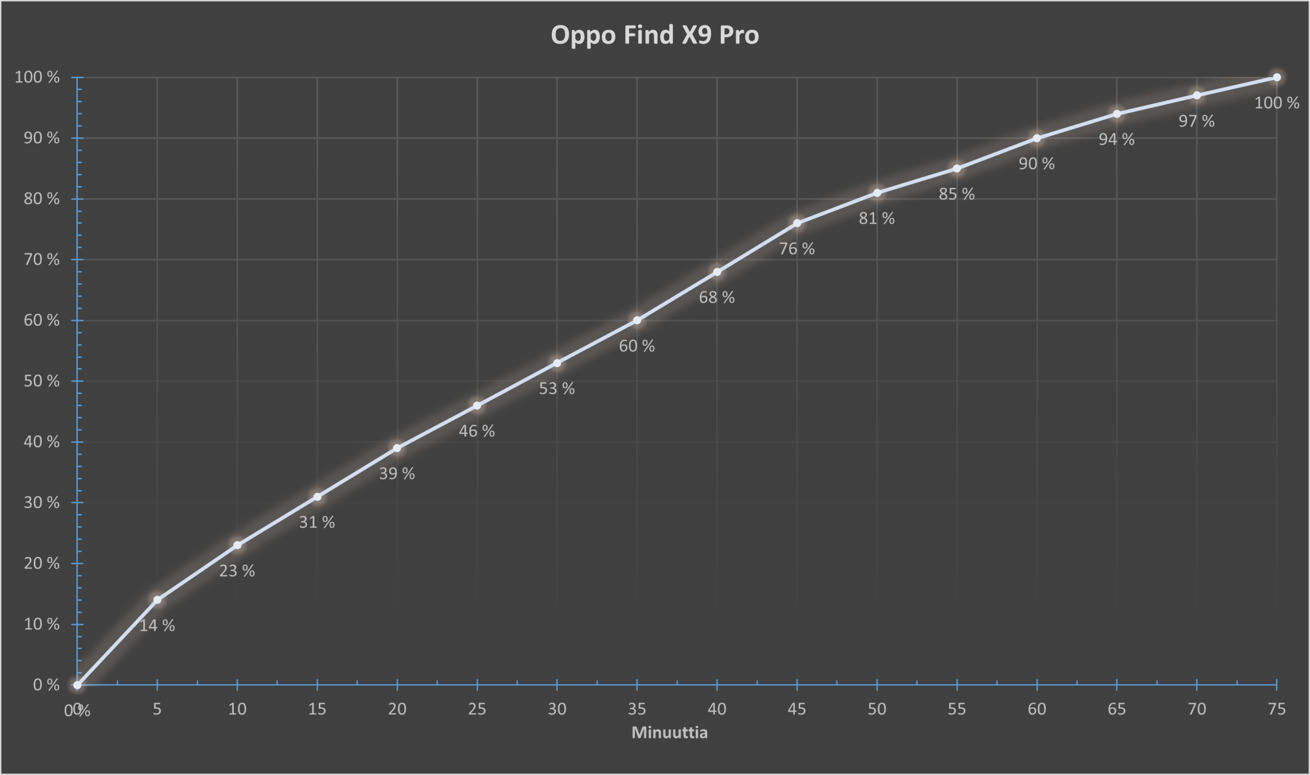 Testijakson aikana puhelimelle toteutettiin tuttu lataustesti 80 watin SuperVOOC-pikalaturilla. Testin perusteella Find X9 Pro latautuu tyhjästä täyteen noin 67 minuutissa. Alapuolella olevasta kuvaajasta näkee, kuinka lataus etenee tasaisen ripeästi koko prosessin ajan.