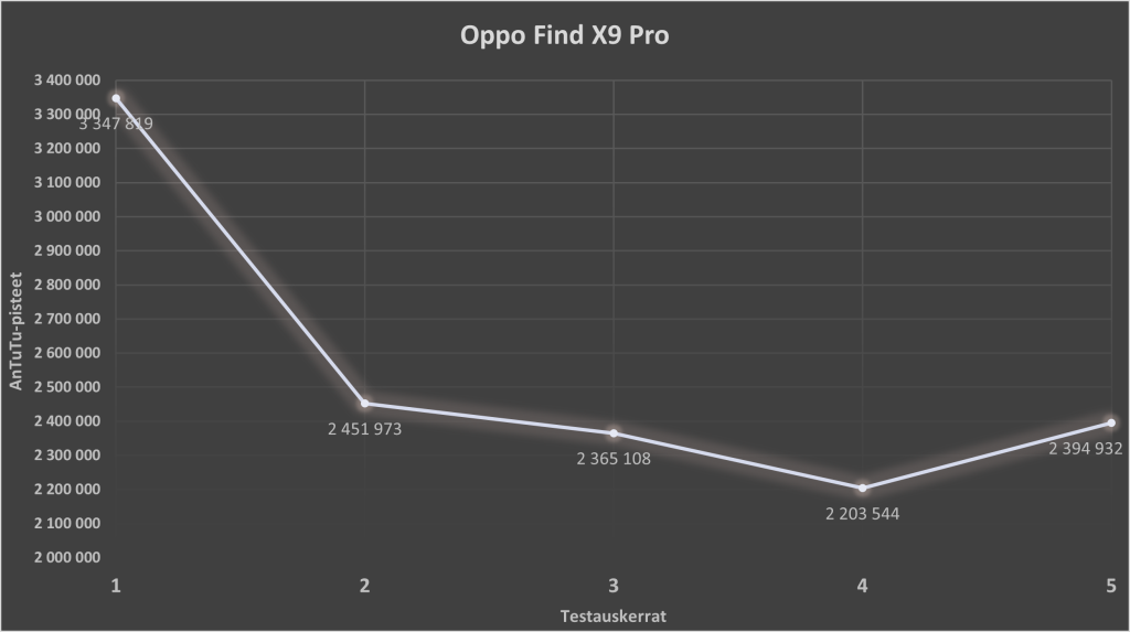 Oppo Find X9 Pro -puhelimella toteutettiin myös tuttu AnTuTu-pohjainen stressitesti, jossa suorituskykytesti toistetaan viisi kertaa peräkkäin. Testin tavoitteena on paljastaa, kuinka hyvin laite säilyttää suorituskykynsä pitkissä ja kuormittavissa tilanteissa, kuten pelisessioissa.