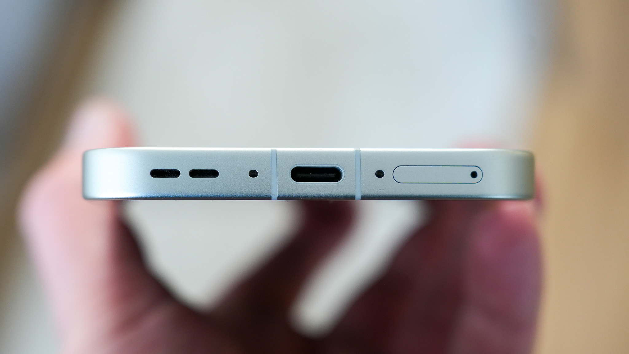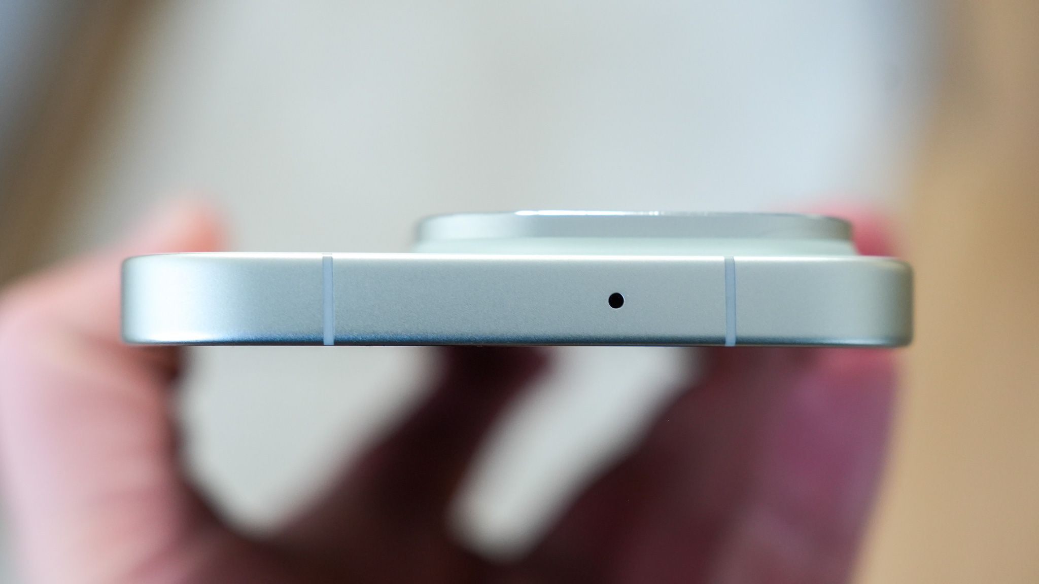 Yläreunaan on saatu ainoastaan infrapunalähetin. Alareunassa on USB-C-liitin, kaiutin, mikrofonit sekä SIM-korttipaikka. Puhelin tukee kahta nano-SIM-korttia, mutta toisen voi korvata eSIMillä. Muistikorttipaikkaa ei ole, mikä on tässä hintaluokassa jo täysin odotettua.