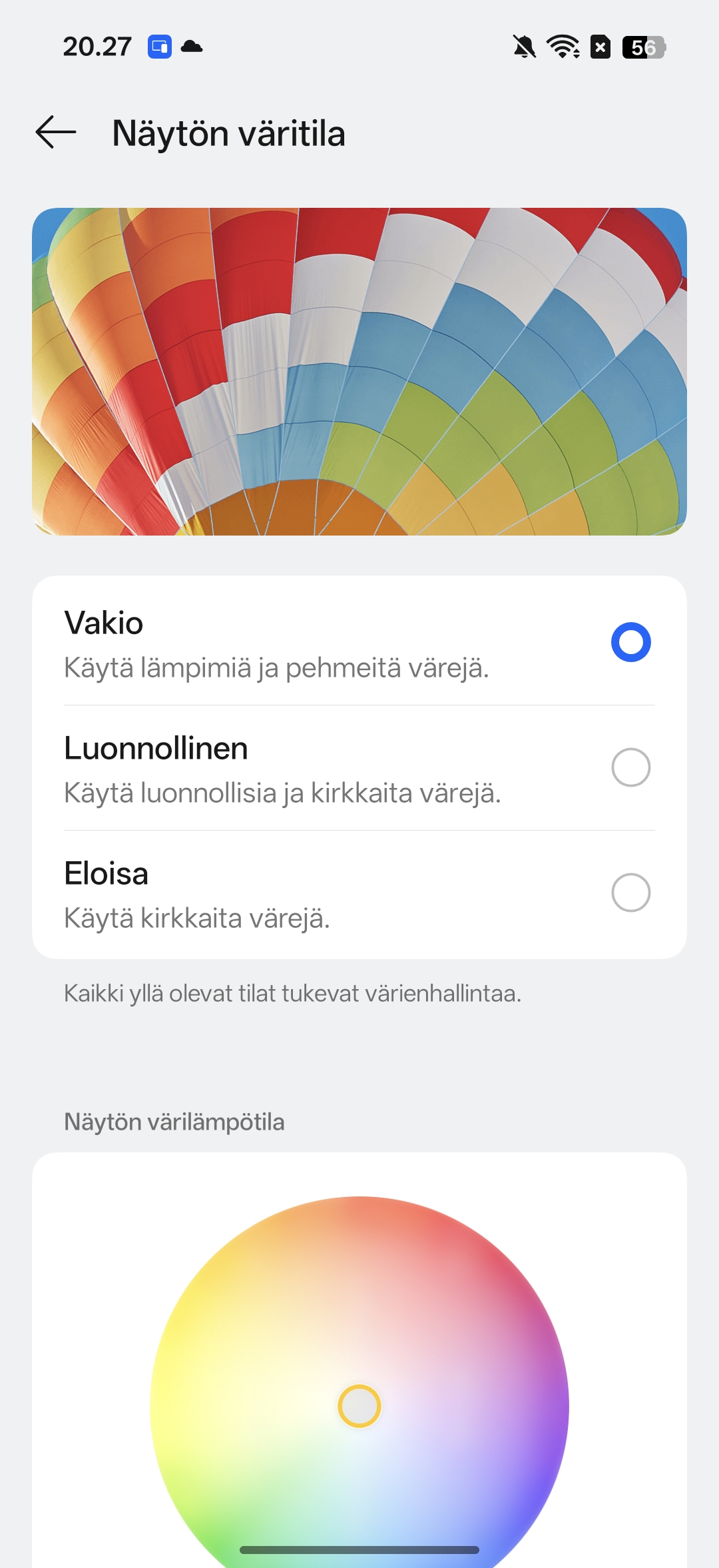 Näyttöä varten Oppo Find X9 Pro tarjoaa pitkälti samat asetukset kuin OnePlussan puhelimet. Asetuksista on mahdollista vaihtaa näytön väritilaa, eli värimaailmaa voidaan muuttaa oletusasetuksista (eloisa, luonnollinen ja vakio). Lisäksi käyttäjät voivat säätää näytön värilämpötilaa kolmesta vaihtoehdosta, jotka ovat lämmin, oletus ja kylmä.
