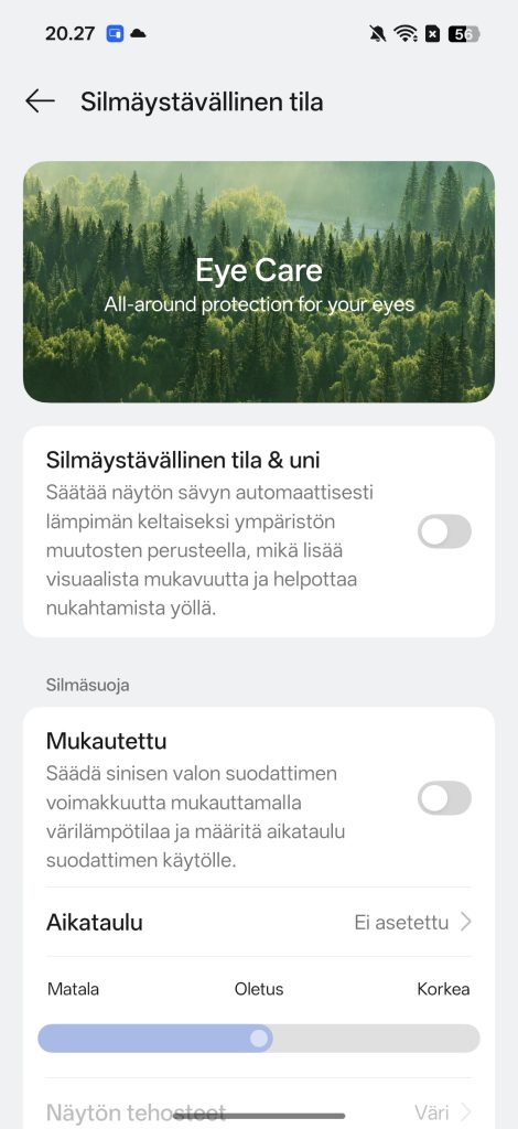 Myös Oppo on panostanut silmäystävällisiin tekniikoihin päivitetyllä 2160 hertsin PWM-himmennyksellä. Se vähentää silmiin kohdistuvaa rasitusta erityisesti heikossa valaistuksessa, mikä on hyväksi silmille erityisesti ennen nukkumaanmenoa. Lisäksi silmäystävällisessä tilassa puhelin osaa automaattisesti säätää näytön värejä keltaisemmaksi sinisen valon minimoimiseksi.