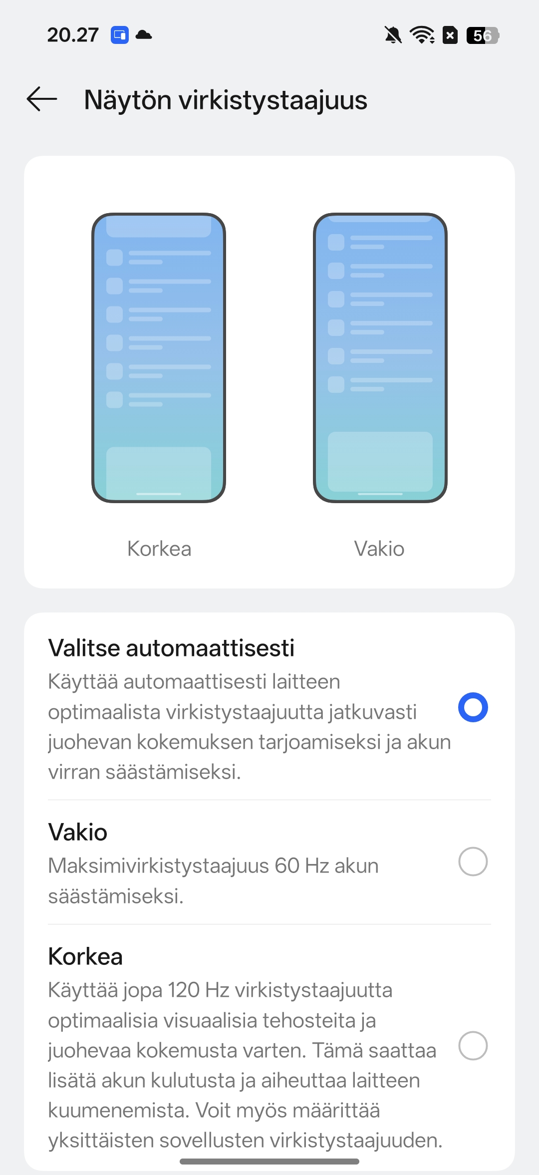 Näytön virkistystaajuutta on mahdollista vaihtaa 60 tai 120 hertsin välillä, joten esimerkiksi 90 hertsin virkistystaajuus ei ole erikseen vaihtoehto. Automaattisessa tilassa puhelin optimoi virkistystaajuuden itse.