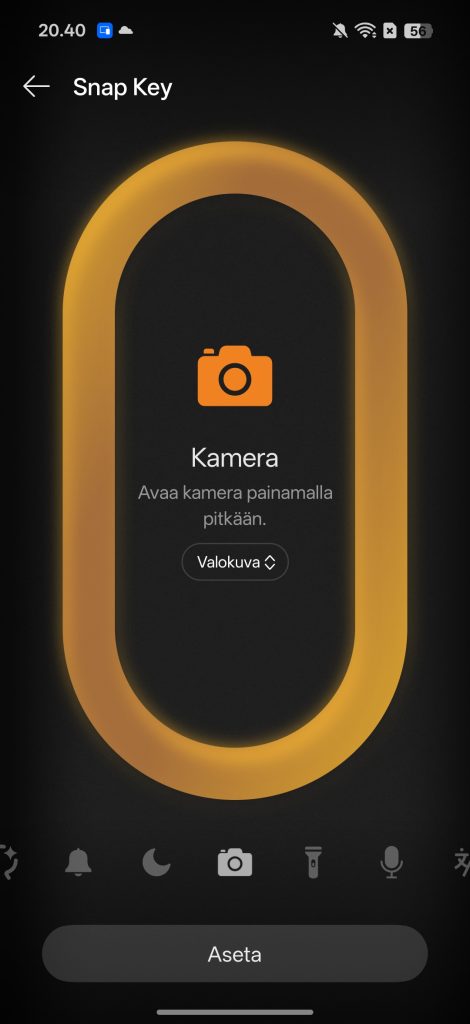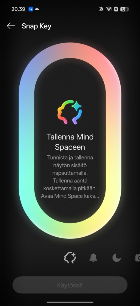 Snap Key sijaitsee puhelimen vasemmassa kyljessä. Sen oletustoiminto on lisätä sisältöä suoraan Plus Mind -tilaan, mutta painikkeen voi ohjelmoida muihinkin tehtäviin. Esimerkiksi sen avulla voi vaihtaa äänitilaa, avata kameran, taskulampun tai kääntäjän. Ominaisuus on kuitenkin vähän teennäinen verrattuna edeltäjän Alert Slider -tilakytkimen yksinkertaisuuteen, josta itse todella pidin. Painikkeen käyttö oli testijakson aikana erittäin vähäistä.