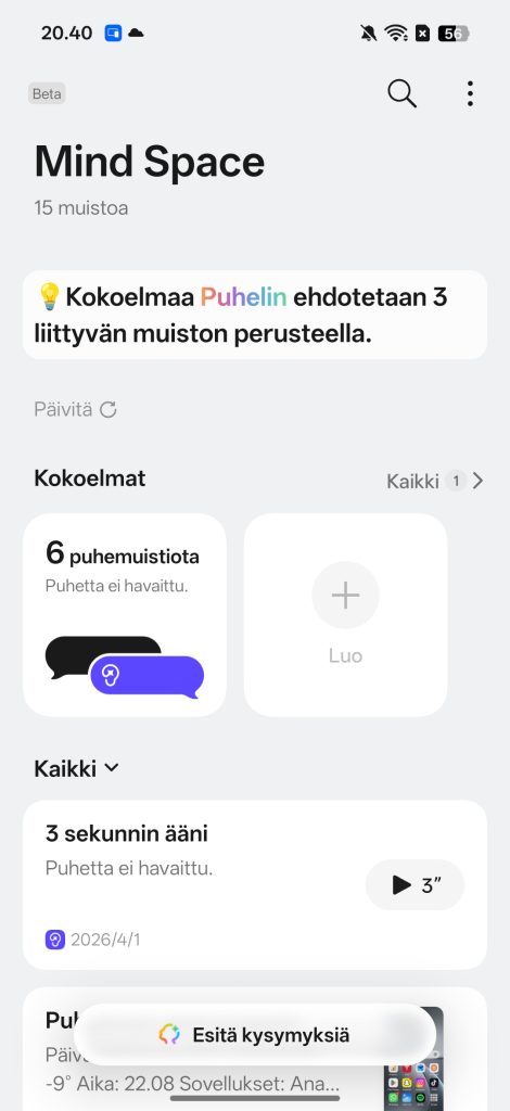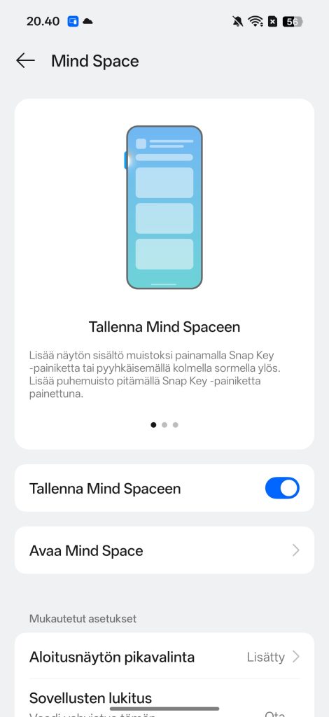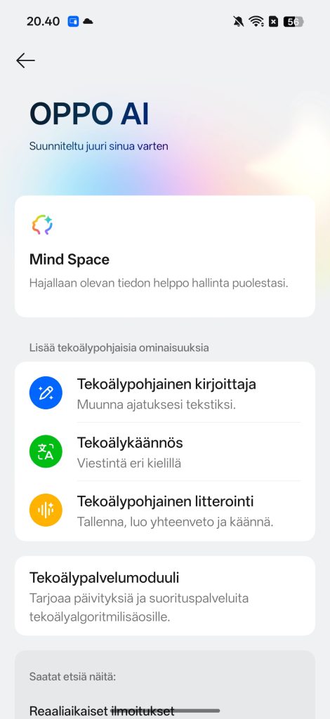 Oppo on panostanut erityisesti tekoälyyn, joka näkyy lähes jokaisessa sovelluksessa. Merkittävin uudistus on AI Mind Space -ominaisuus, joka toimii eräänlaisena älykkäänä muistikerroksena käyttöliittymän sisällä. Kun ruudulta haluaa tallentaa asioita myöhempää käyttöä varten, erillistä kuvakaappausta ei tarvita, vaan Mind Space tulkitsee sisällön automaattisesti ja järjestää sen selkeäksi kokonaisuudeksi. Mind Space toimii yhdessä puhelimen uuden Snap Key -painikkeen kanssa, jolla voi helposti tallentaa tietoja tekoälylle.