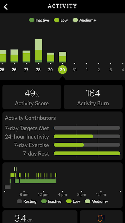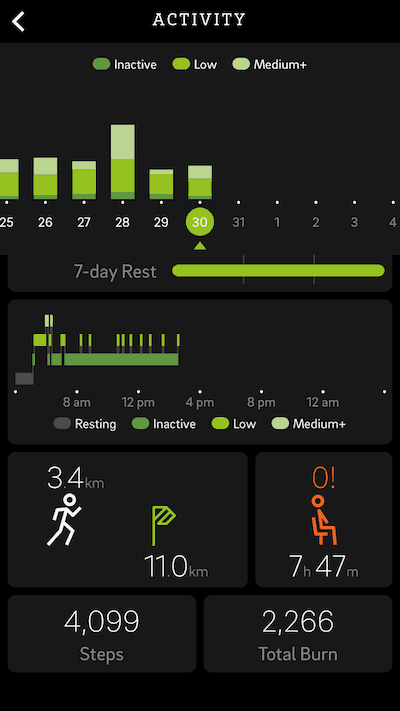 Lopussa käyttäjälle näytettään lisäksi datan jakautuminen eri osa-alueille. Esimerkiksi aktiivisuusosiossa käyttäjä näkee askelmäärän ja kuinka pitkää matkaa kilometreinä kyseinen askelmäärä vastaa. Samassa kohtaa sovellus näyttää myös päiväkohtaisen tavoitteen kilometreinä. Sovellus näyttää myös ajan kuinka kauan olet ollut paikoillasi ja näyttää lukeman istuvana tikku-ukkona ja sen yläpuolella oleva luku kertoo tunnit joiden aikana et ole liikkunut yhtään.