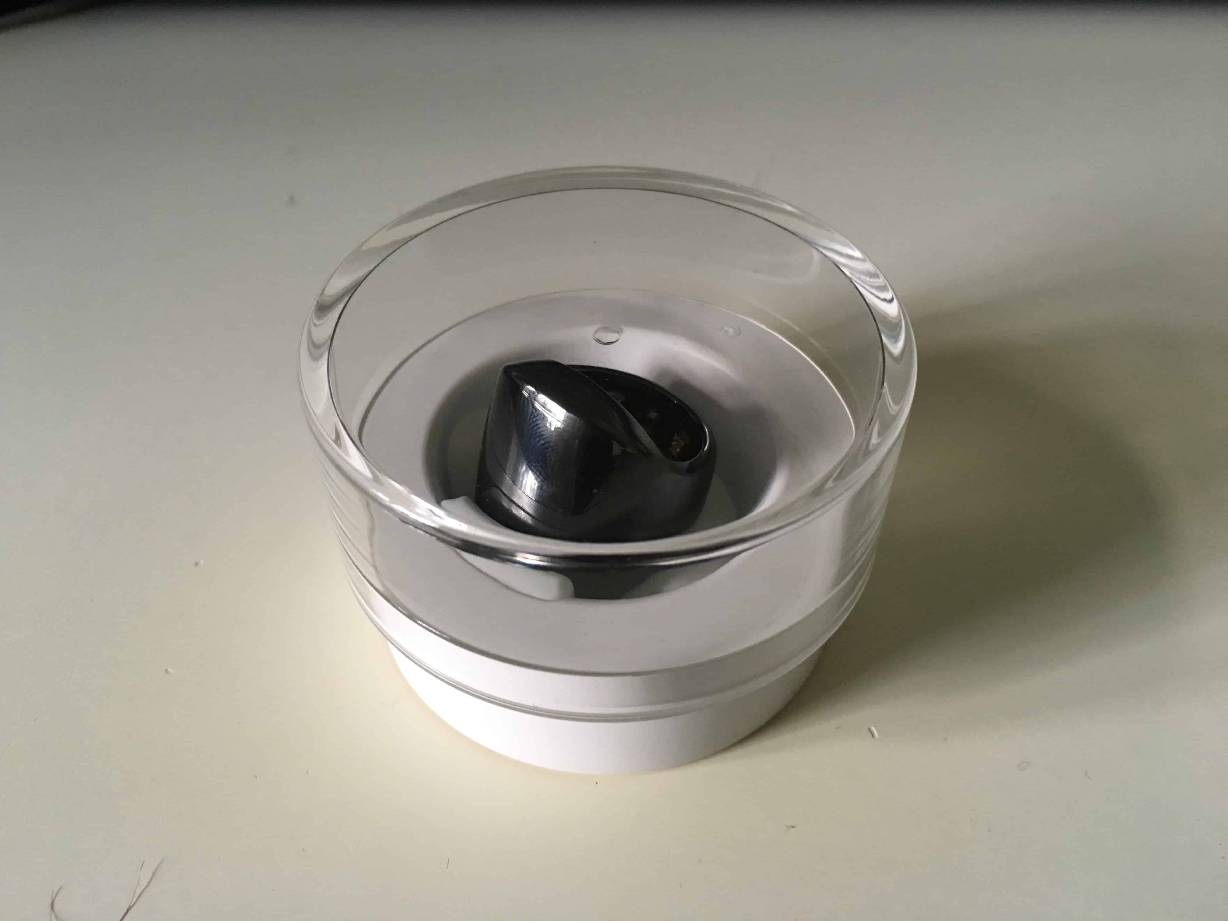 Laite on siis pakattu valkoiseen pieneen laatikkoon. Laatikkoa voisi helposti verrata korun sisältävään yllätykseen, jonka olet juuri ostanut paremmalle puoliskollesi. Itse pakkauksen sisältä löytyy sormusrasia jonka päälipuoli on läpinäkyvää muovia, jonka läpi itse sormus näkyy. Sormuslaatikko ei itseasiassa ole mikä tahansa laatikko, vaan se toimii myös sormuksen lataustelakkana. Laatikon sisällä on kaksi pientä metallista klipsiä jotka löytyvät myös itse sormuksen sisäpuolelta. Näiden klipsien yhdistäminen käynnistää sormuksen latautumisen. Sormuksen lataaminen tyhjästä täyteen kestää noin tunnin.