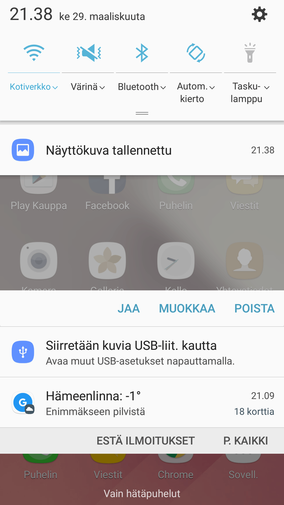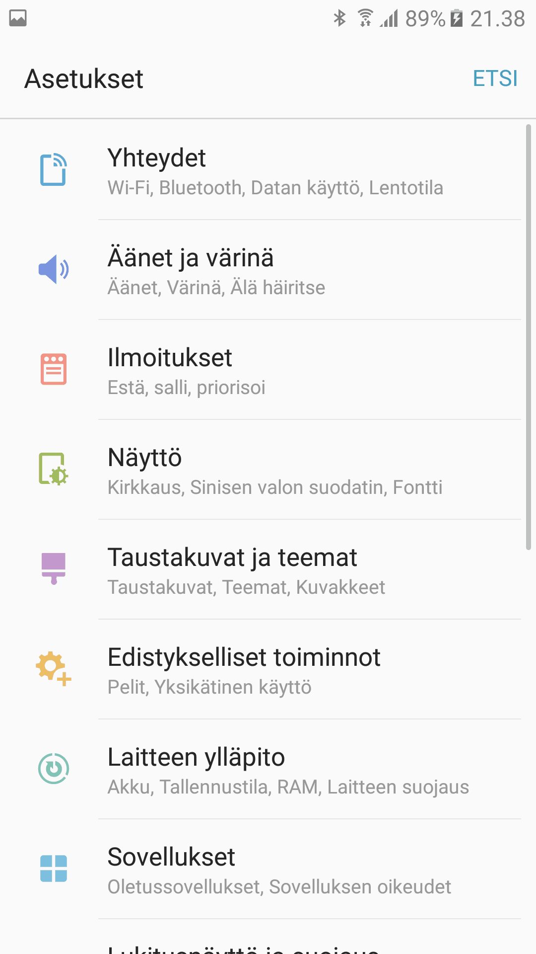 Galaxy A5:ssä on Samsungin Grace UX -käyttöliittymä, joka nähtiin ensimmäistä kertaa Galaxy Note 7:n julkaisun yhteydessä. Käyttöliittymä on nyt huomattavasti yksinkertaisempi ja pelkistetympi kuin Samsungin aikaisempi TouchWiz-käyttöliittymä. Testijakson aikana en huomannut ohjelmistossa ongelmia ja kaikki toimi niin kuin pitikin. Alla muutama ruutukaappaus käyttöliittymästä.