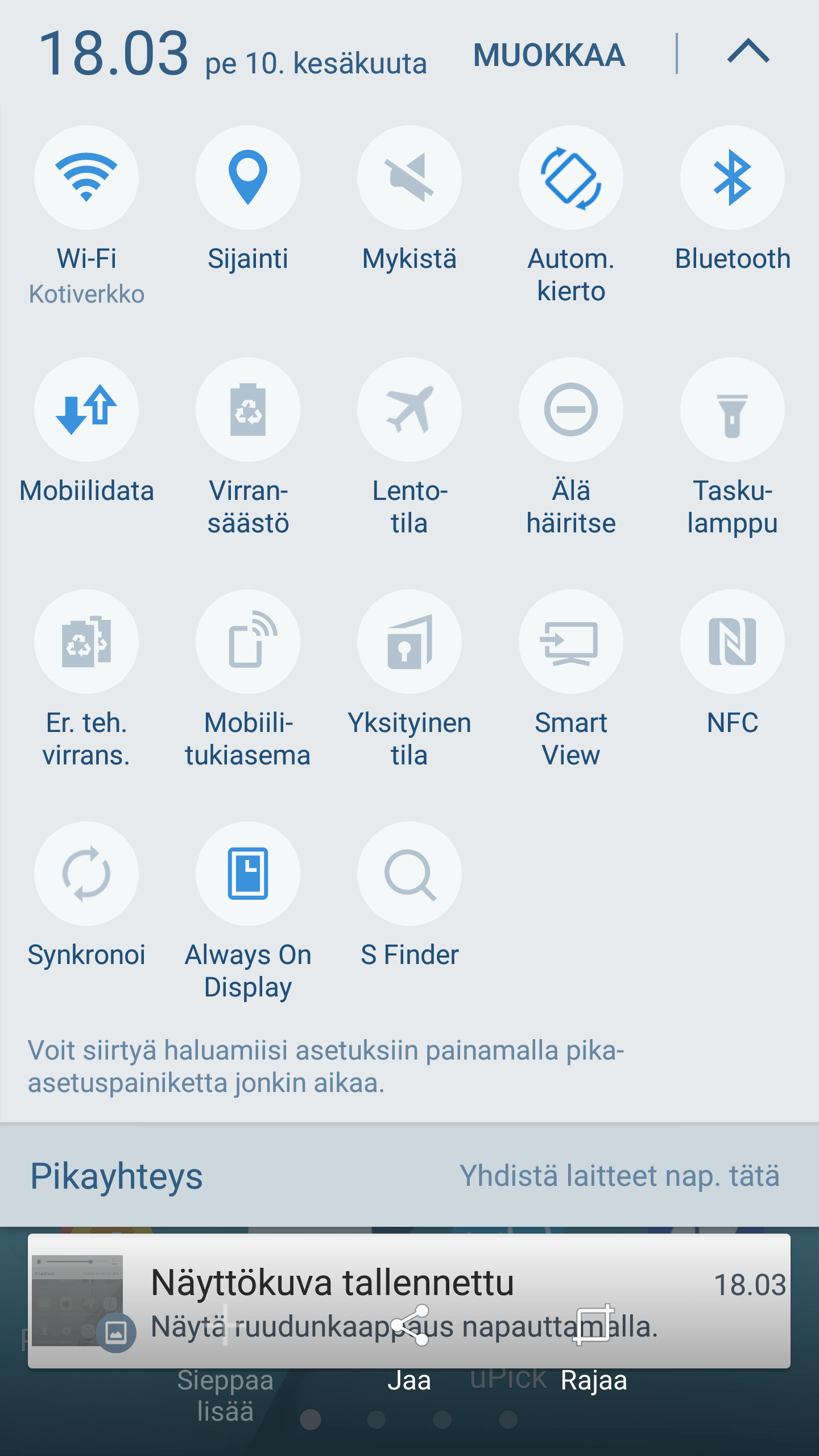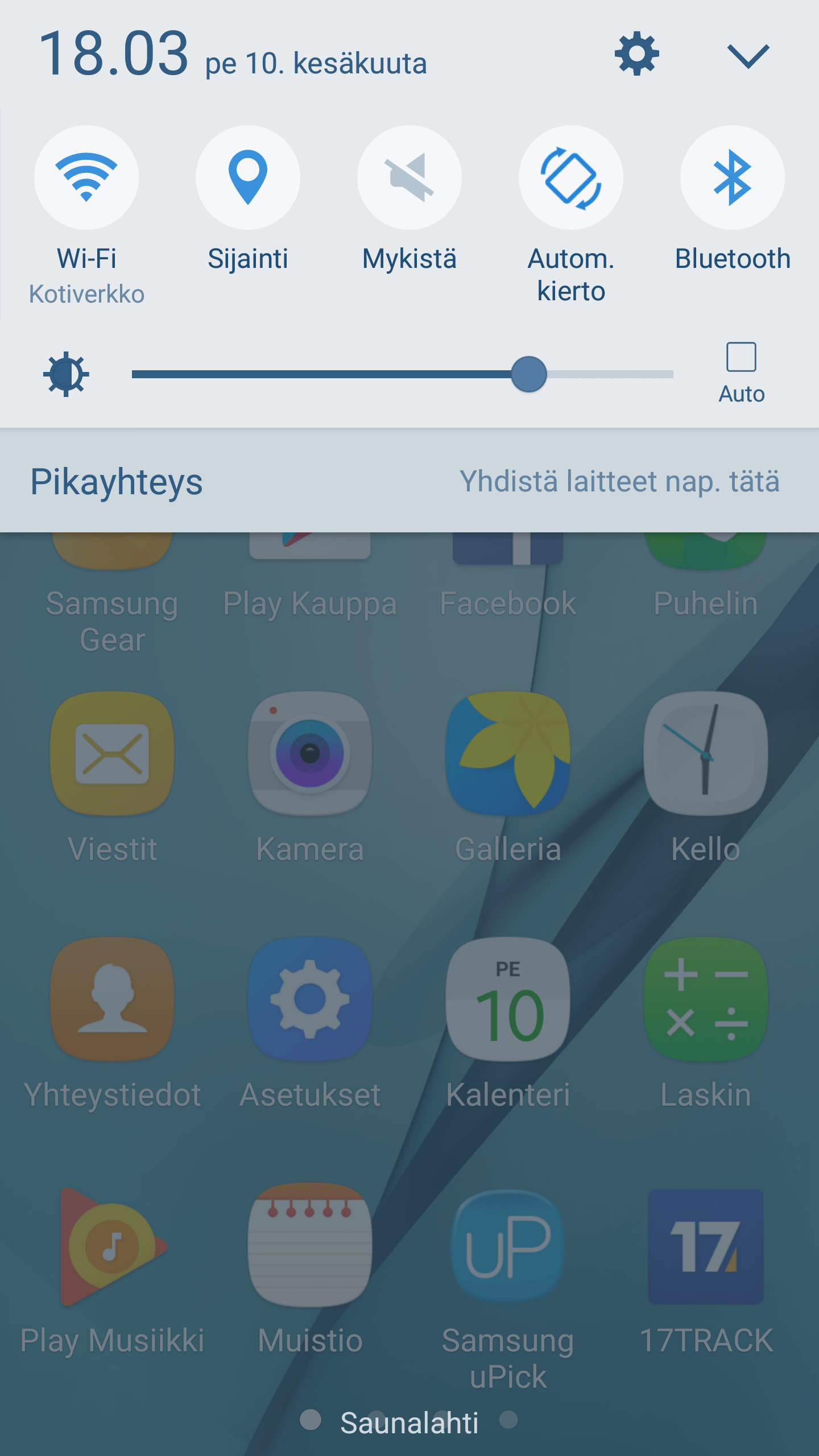 Toinen mainittava ominaisuus on vain Galaxy S7 edgessä hyödynnettävä reunanäyttöasetus. Reunanäytöistä löytyy monia ominaisuuksia, joiden hyödyllisyydestä ainakaan itse en osaa sanoa mitään, sillä ne jäivät testijakson aikana todella vähälle käytölle. Reunapaneelin saa auki puhelimen ollessa päällä ja vetämällä reunanäytön niin sanotusta kahvasta, jolloin tulee esille ”People edge”, ”Apps edge” sekä ”Tasks edge”. People edgeen voi halutessaan asettaa viisi suosikkiyhteyshenkilöä, jolloin jokaisella on oma väri, joka auttaa erottamaan vastaanotettavan puhelun esimerkiksi näytön ollessa alaspäin pöydällä. Apps edgeen voi taas asettaa kymmenen sovellusta, josta ne pitäisi olla helposti avattavissa ”vain yhdellä pyyhkäisyllä”. Tasks edge on taas valikko, jonne voi luoda kymmenen pikavalintaa, joiden avulla voi käyttää tiettyjä toimintoja tai kommunikoida suosikkiyhteyshenkilöiden kanssa nopeasti ja helposti.