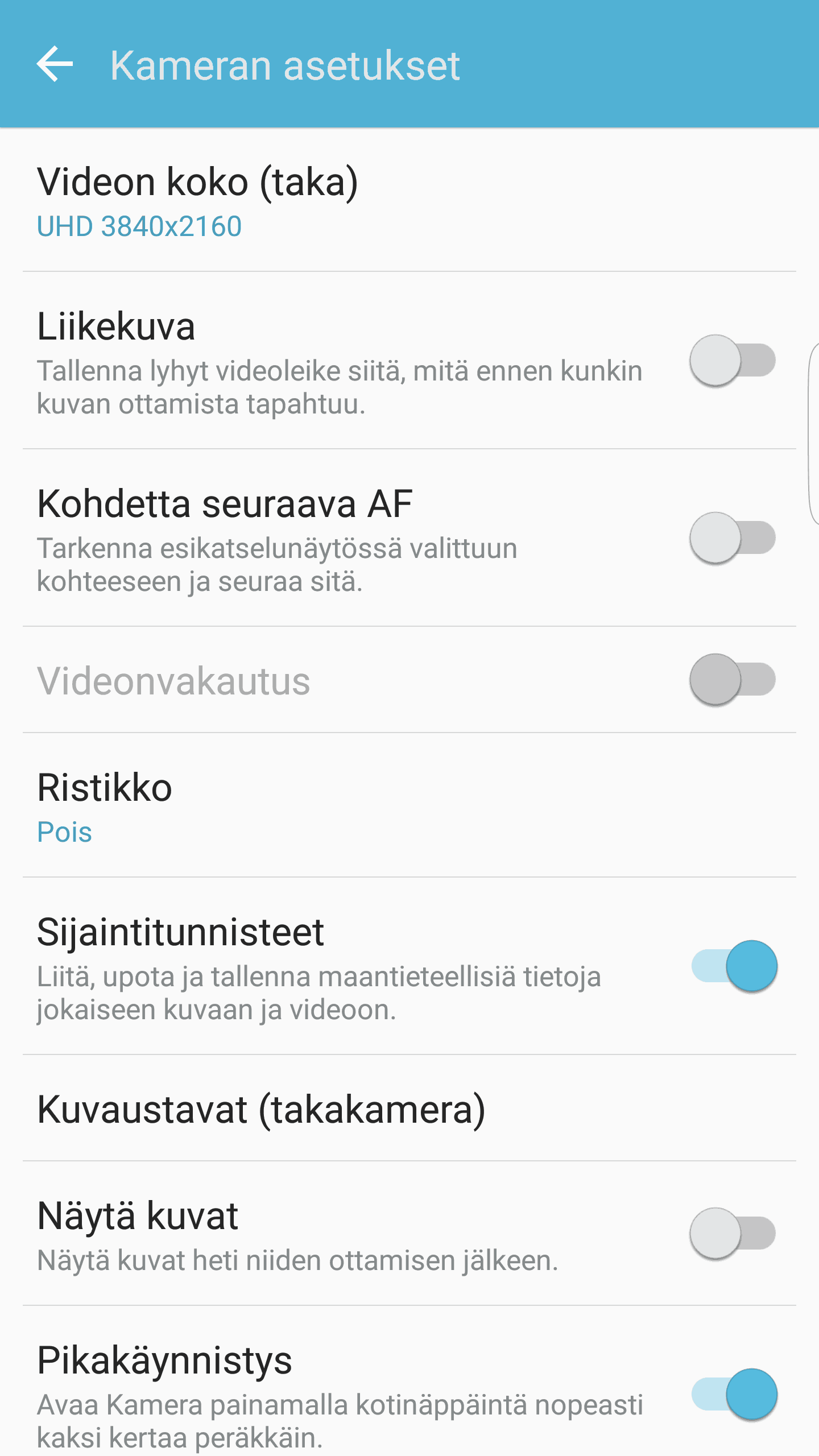 Samsung on tehnyt mielestäni mielenkiintoisen ratkaisun, kun Galaxy S7 -mallien kohdalla kameran megapikselien määrä on tipahtanut 16 megapikselistä 12 megapikseliin. Samsung kuitenkin osaa taitavasti osoittaa Galaxy S7 -mallien kanssa, että megapikselien määrällä ei ole suurta vaikutusta kuvanlaatuun. Olen henkilökohtaisesti kuitenkin hieman pettynyt, että Samsung on vaihtanut kuvien 16:9 kuvasuhteen neliömäisempään 4:3 kuvasuhteeseen. Itse tykkään kuvata kuvia 16:9 kuvasuhteella, mutta onneksi tämäkin on mahdollista muuttamalla hieman kameran asetuksia. Ongelmaksi kuitenkin tulee, että samalla kuvien laatu heikkenee.
