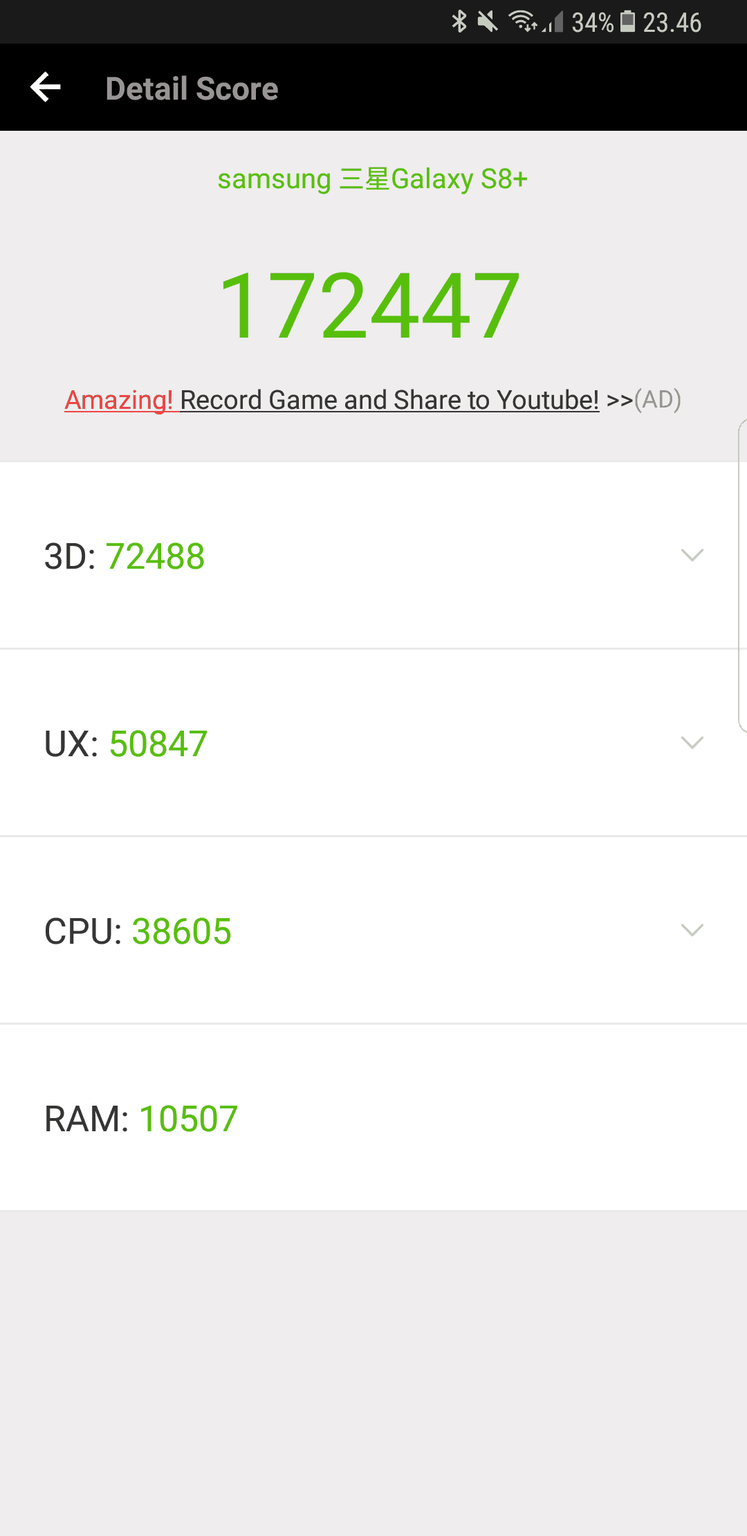 Vaikka Samsung on tehnyt uutuuspuhelimista tehokkaita, niin puhelimet eivät pääse loistamaan suorituskykymittauksissa. Ajoimme Galaxy S8 -puhelimissa läpi perinteiset Geekbench 4- ja AnTuTu -suorituskykytestit, joissa puhelimet pärjäsivät hyvin, mutta eivät päässeet aivan tuoreimpien Snapdragon 835 -järjestelmäpiiriin perustuvien puhelimien tasolle. AnTuTu:n testissä Galaxy S8+ sai mukavat 172 447 pistettä, joka on varsin hyvin, mutta verrattuna OnePlus 5:n 181 321 pisteeseen eroa on vielä huomattavasti.