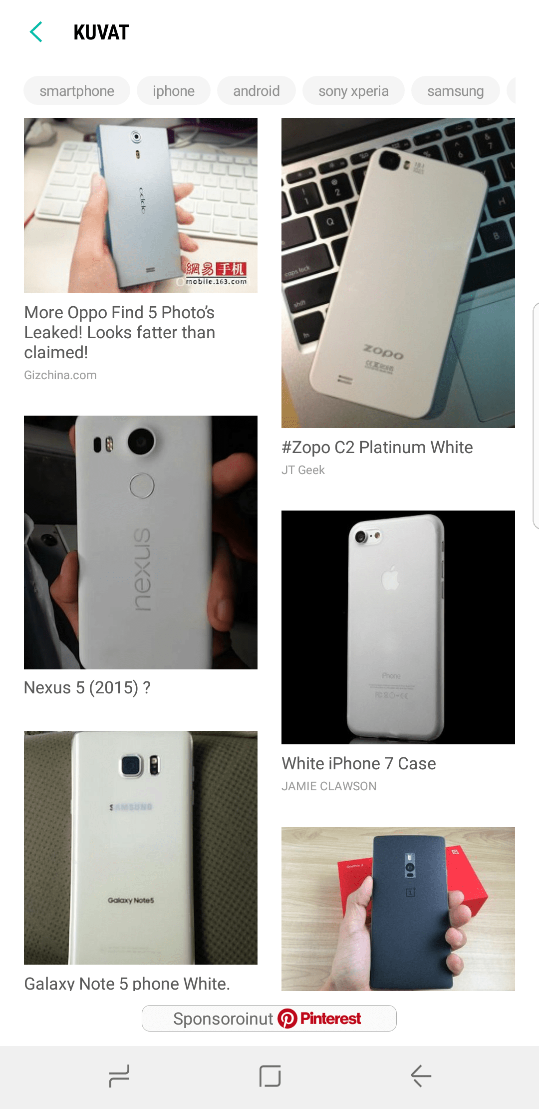 Suomessa Bixby ei kuitenkaan osaa puhua, eikä sille voi puhua. Aluksi Bixbyn kerrotaan tukevan vain koreaa, jonka jälkeen tuki tulee englannille sekä kiinalle. Samsung ei ole kertonut mitään muiden kielien kohtalosta, joten suomea tuskin kannattaa odotella puhelimeen. Suomessa Bixbyn hyödyt jäävät pääasiassa kuvan perusteella tietojen hakemiseen, joka tosin ei tunnu kovin erikoisesti toimivan. Testasin ominaisuutta esimerkiksi ottamalla kuvan Nokia 6 -puhelimesta, jolloin Bixby haki internetistä vain kuvia puhelimista, joista yksikään ei ollut edes Nokia-merkkinen.