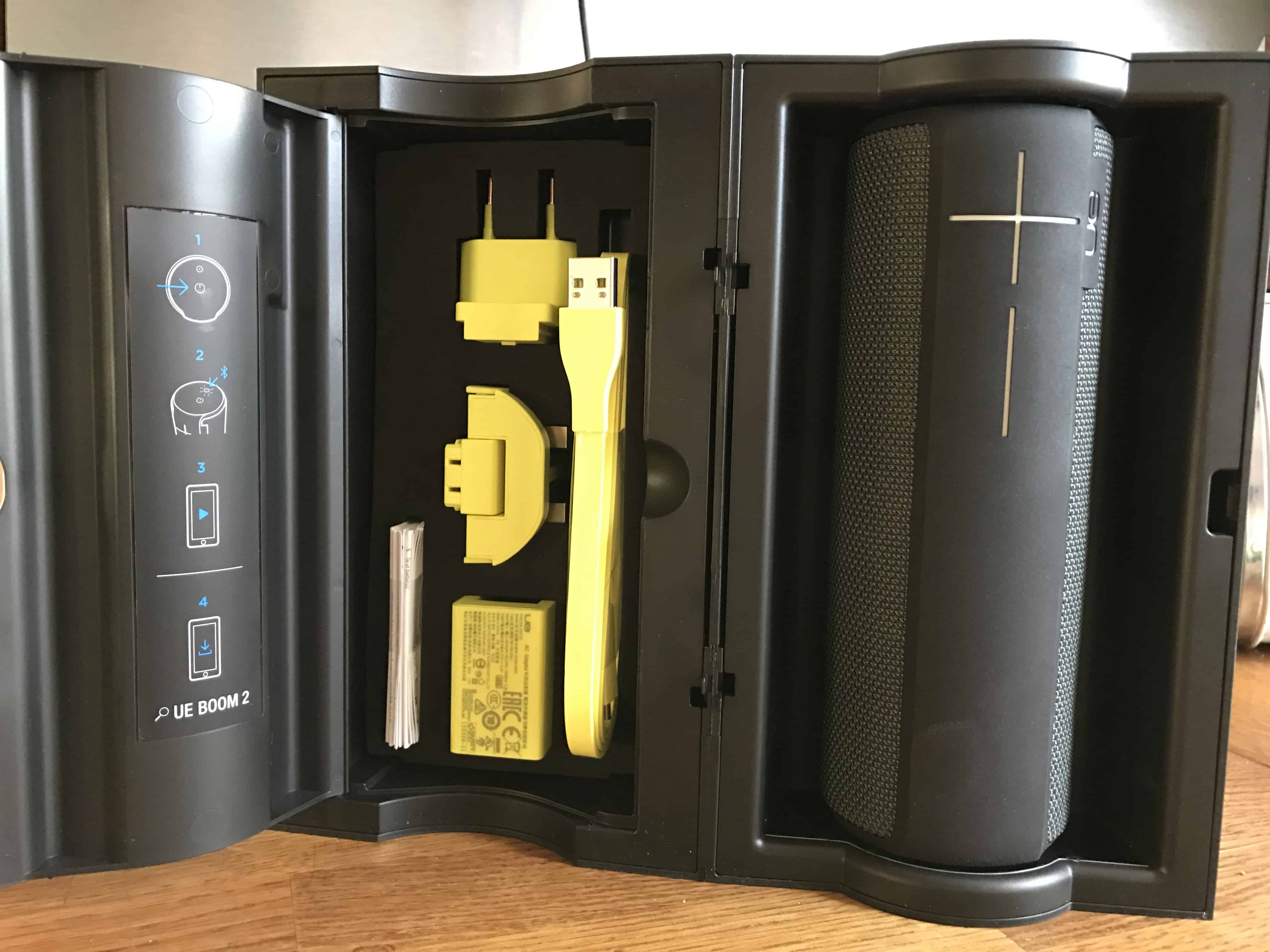 Itse tuotteen pakkaus avautuu nätisti sivuttain, ja paketin toisesta osiosta löytyy itse UE BOOM 2 kaiutin, ja toiselta puolelta pakettia sitten tarvittavat oheistavarat, kuten laturi, micro-usb latausjohto ja erilliset latausadapterit EU- ja UK-pistoikkeisiin. Paketti on hyvin koottu ja on todella tukeva, joka helpoittaa laitteen ottamista mukaan pitemmillekin matkoille jos on tarvetta suojella itse kaiutinta mahdollisilta vahingoilta.