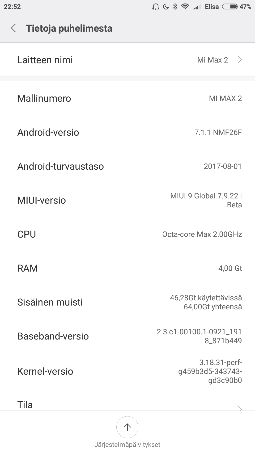 Vakaa versio MIUI:sta tuntui kuitenkin liian toimivalta, jonka takia asensin puhelimeen testiksi myös MIUI 9 Global Beta -version. Suurin syy tähän oli kuitenkin mukaan saatu suomen kieli, jota ei ole koskaan ennen Xiaomin virallisista käyttöliittymistä löytynyt. Nyt MIUI 9:n kohdalla suomen kieli on kehitysvaiheessa, eikä vielä kaikilta osin täydellisesti optimoitu. MIUI 9:n tärkein uudistus kuitenkin Mi Max 2:n kohdalla on jaetun näytön näkymä, jossa on mahdollista käyttää siis kahta sovellusta rinnakkain. Testissä MIUI 9:n testiversion kanssa ei tullut vastaan mitään ongelmia ja se tuntui toimivan erinomaisesti, vaikka kyseessä ei ole vielä valmis ohjelmisto. Alla muutamia kuvia MIUI 9:stä.
