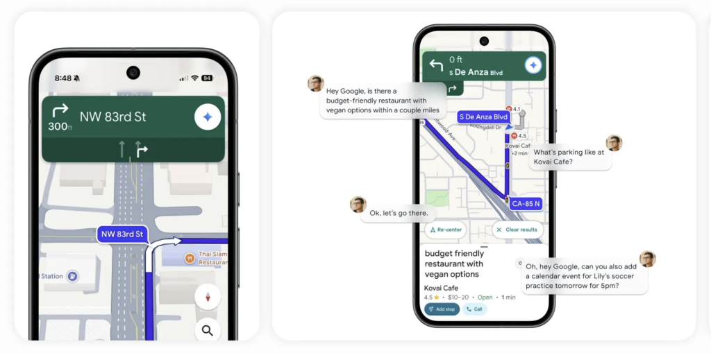 Geminin myötä myös ajo-ohjeet muuttuvat luonnollisemmiksi. Perinteisten katujen ja numeroiden sijaan Maps alkaa käyttää maamerkkejä reittiohjauksessa. Käyttäjä voi siis pian kuulla ohjeita tyyliin “käänny oikealle Thai Siam -ravintolan jälkeen”. Nämä maamerkit näkyvät samalla korostettuina kartalla. Ominaisuus on jo saatavilla Yhdysvalloissa Android- ja iOS-laitteille.