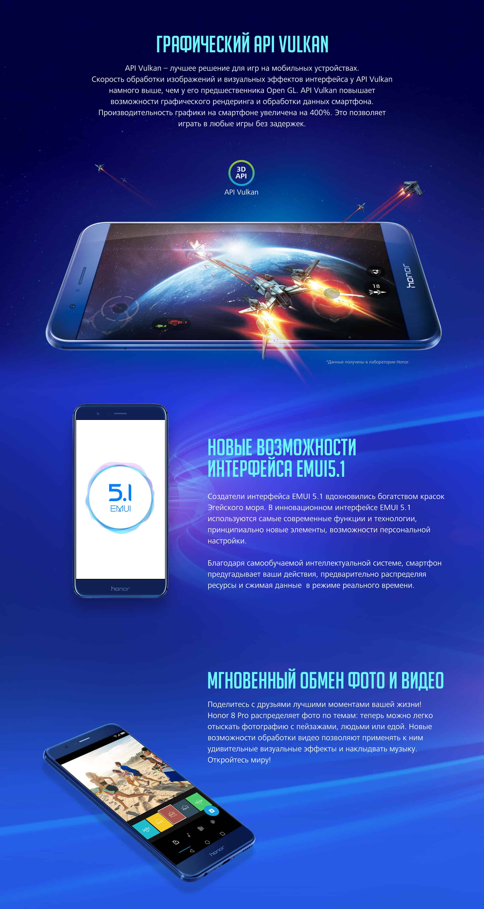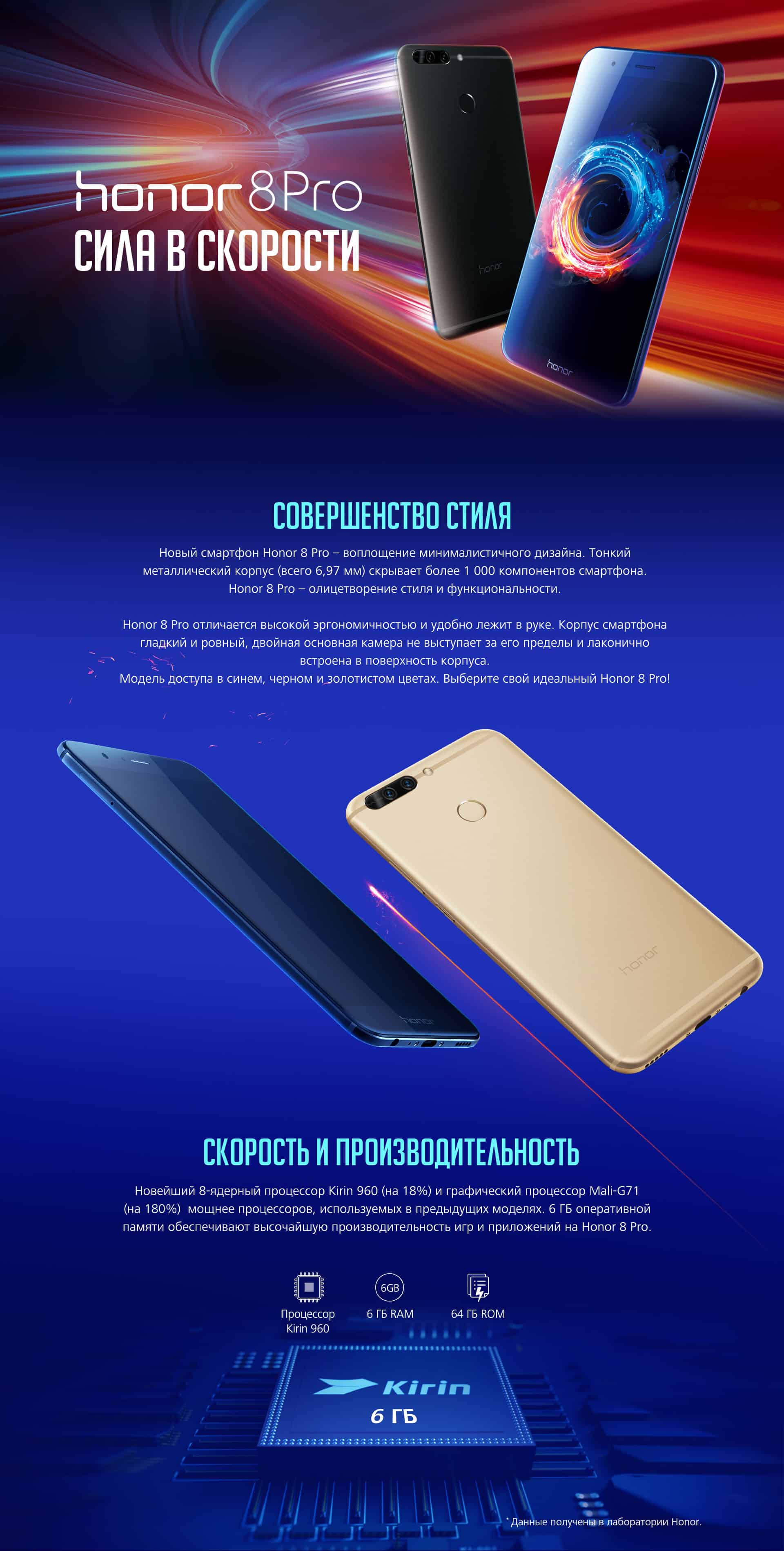 Puhelimen näyttö on 5,7 tuumaa ja se on QHD -tasoinen (1440 x 2560 pikseliä). Laitteen sisuksissa hyrrää Huawei Mate 9 -puhelimesta tuttu kahdeksanytiminen Kirin 960 -järjestelmäpiiri, jonka tukena on 6 gigatavua RAM-muistia. Sisäistä tallennustilaa Honor 8 Pro tarjoaa 128 gigatavua, mutta jos tämä ei riitä on puhelimeen mahdollista asettaa myös muistikortti. Nyt julkaistussa puhelimessa on luonnollisesti myös Android 7.0 Nougat -käyttöjärjestelmä, jonka päällä on Huawein EMUI 5.1 -käyttöliittymä.