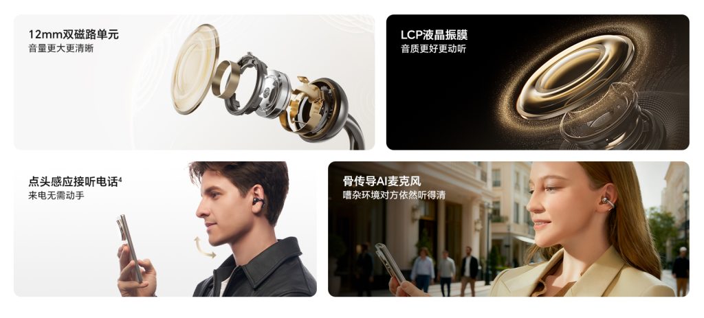 Puheluihin kuulokkeet tarjoavat luujohtoon perustuvan AI-mikrofonijärjestelmän, joka tunnistaa käyttäjän puhevärähtelyt kasvojen luustosta. Tämä auttaa erottamaan puheen ympäristömelusta selkeästi jopa vilkkailla kaduilla. Lisäksi kuulokkeet tukevat pään nyökkäyksellä tapahtuvaa puhelun vastaanottoa, jolloin vastaaminen onnistuu ilman napautuksia tai puhelimen kosketusta.