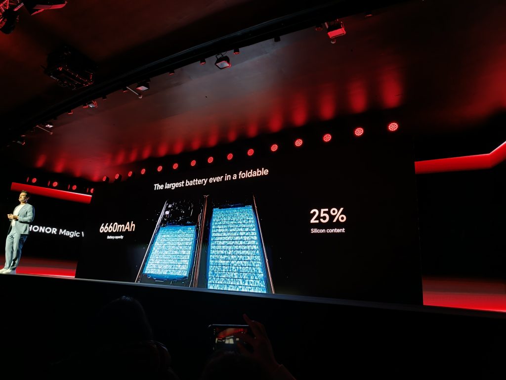 Tuloksena on peräti 6 660 milliampeeritunnin akku, joka on poikkeuksellisen suuri ohuessa taittuvassa puhelimessa. Honor esitteli messuilla myös tulevaisuuden niin sanotun Silicon-carbon Blade Battery -ratkaisun, joka voi mahdollistaa jopa 7 000 mAh akkujen aikakauden taittuvissa laitteissa.