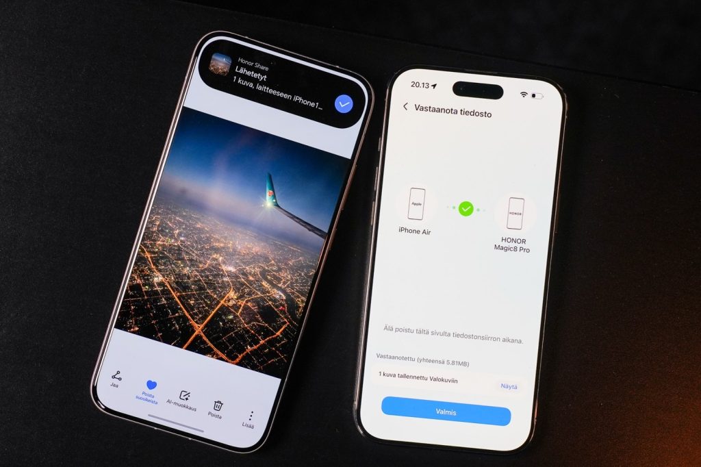 HONOR Onetapilla ideana on jakaa valokuvat, videot, tiedostot, kalenterit, yhteystiedot ja muuta yhdellä napautuksella, ja se kiinnostavin osa on, että jakaminen onnistuu myös iPhonen tai Macin kanssa. Käytännössä tämä nojaa siihen, että laitteissa on NFC päällä ja tarvittavat sovellukset löytyvät (Apple-laitteille HONOR Connect, Maceille HONOR Super Workbench / Honor WorkStation). Kun palaset ovat paikallaan, jakaminen muuttuu erittäin vaivattomaksi ekosysteemien välillä.