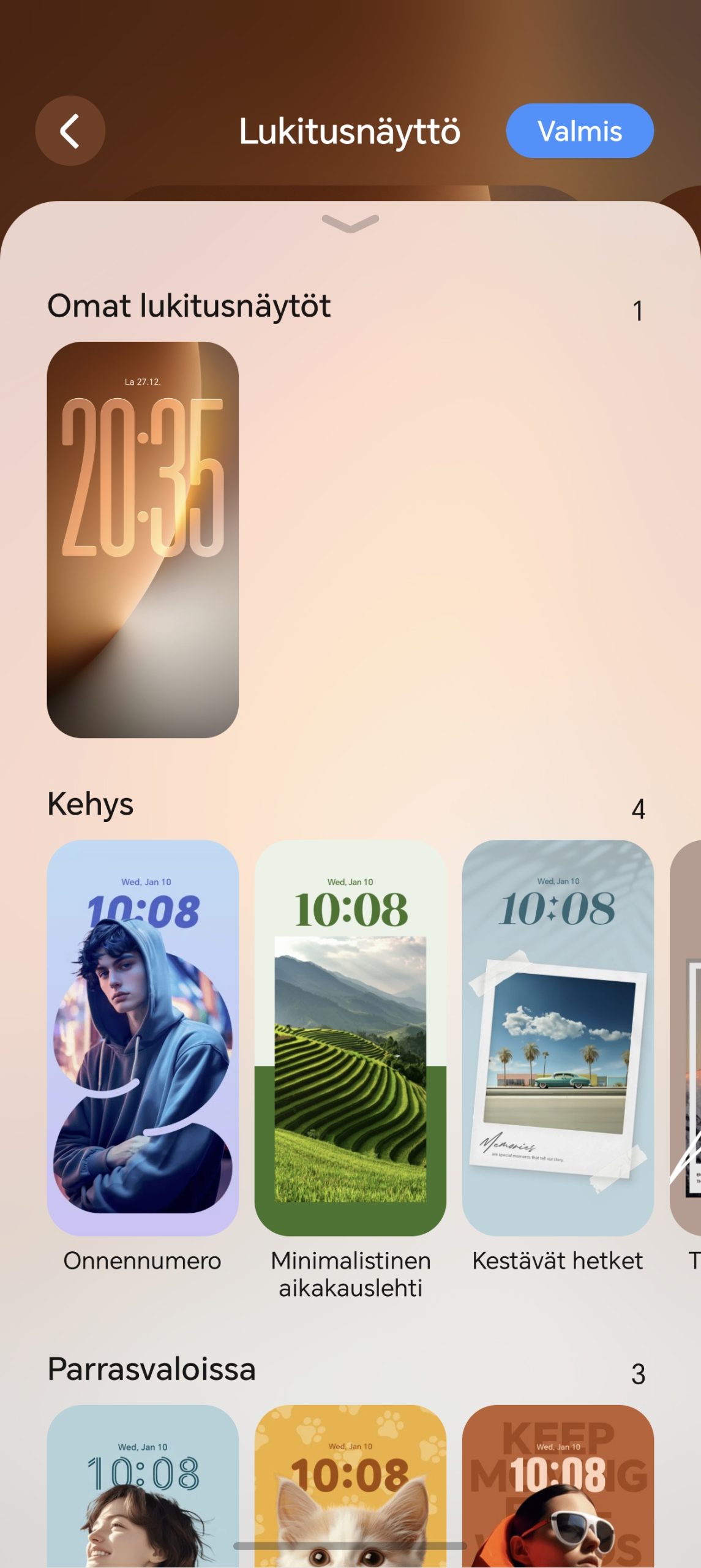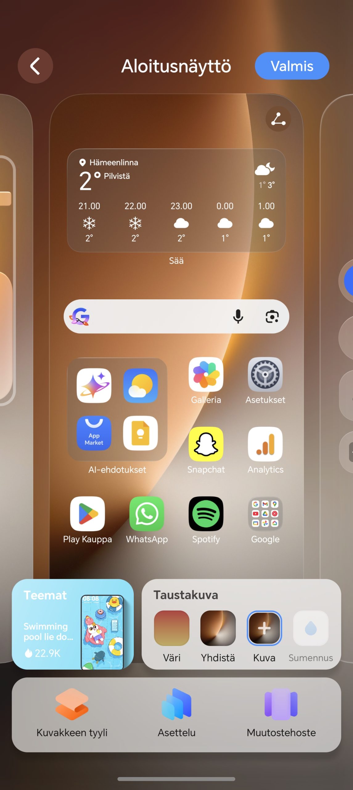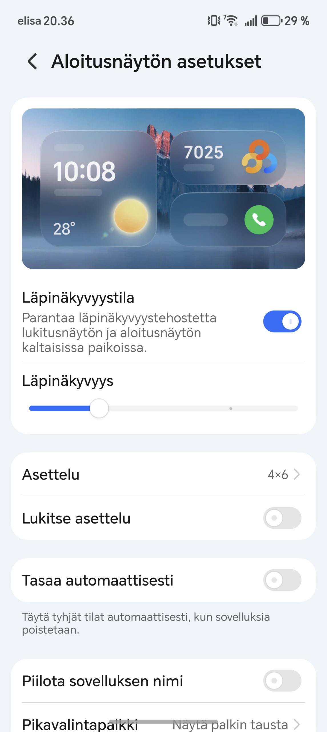 Personoinnin voi aloittaa Magic-lukitusnäytöstä ja mukautetusta kellotaulusta. Kun säätää lukitusnäytön tyyliä, läpinäkyvyys ja elegantit grafiikat tekevät ison eron päivittäiseen fiilikseen. Valitse elävä taustakuva tai luonnon elementtejä hyödyntävä näkymä, mutta pidä kokonaisuus ilmavana, silloin myös luettavuus pysyy hyvänä. Aloitusnäytöllä voi muokata läpikuultavuuden syvyyttä, kuvakkeiden kokoa sekä tyyliä, mutta myös widgettejä, asettelua sekä tehosteita.