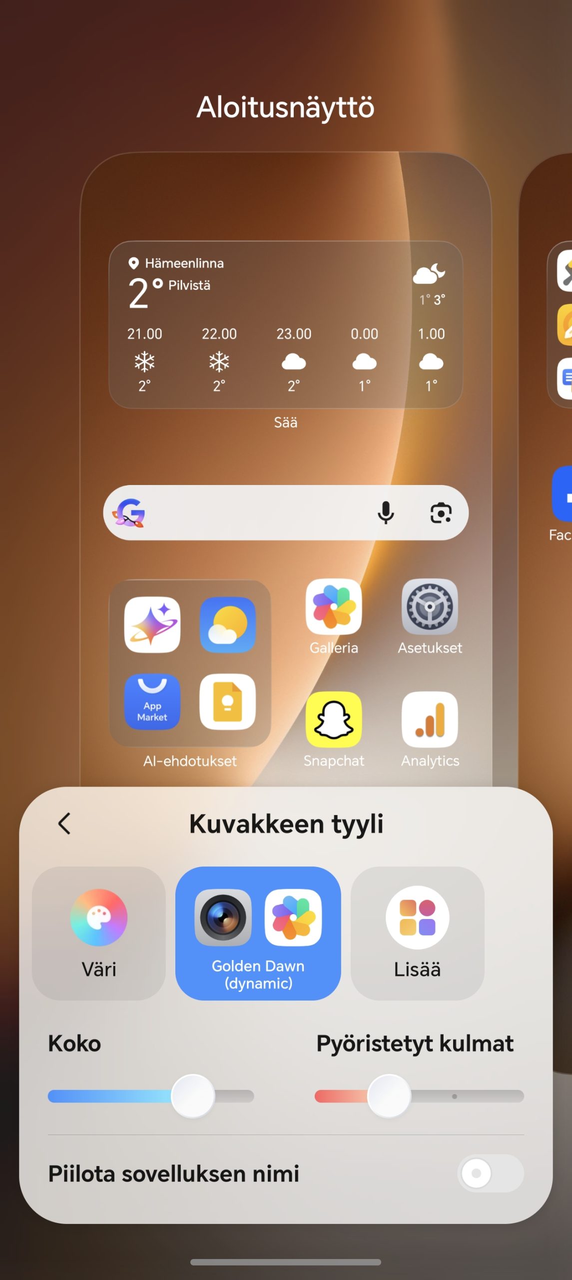 MagicOS 10:n muotoilussa on selkeä teema, ja se on läpikuultavuus. Se näkyy lukitusnäytössä, työpöydällä, kuvakkeissa ja jopa säänäkymässä. Honorin mukaan kyseessä ei ole pelkkä “lasiefekti”, vaan enemmänkin tapa tehdä käyttöliittymästä kevyempi. Kun elementit eivät ole raskaita ja tummia laatikoita, ruutu tuntuu isommalta ja selkeämmältä, ja samalla se näyttää modernilta ilman, että se menee överiksi.