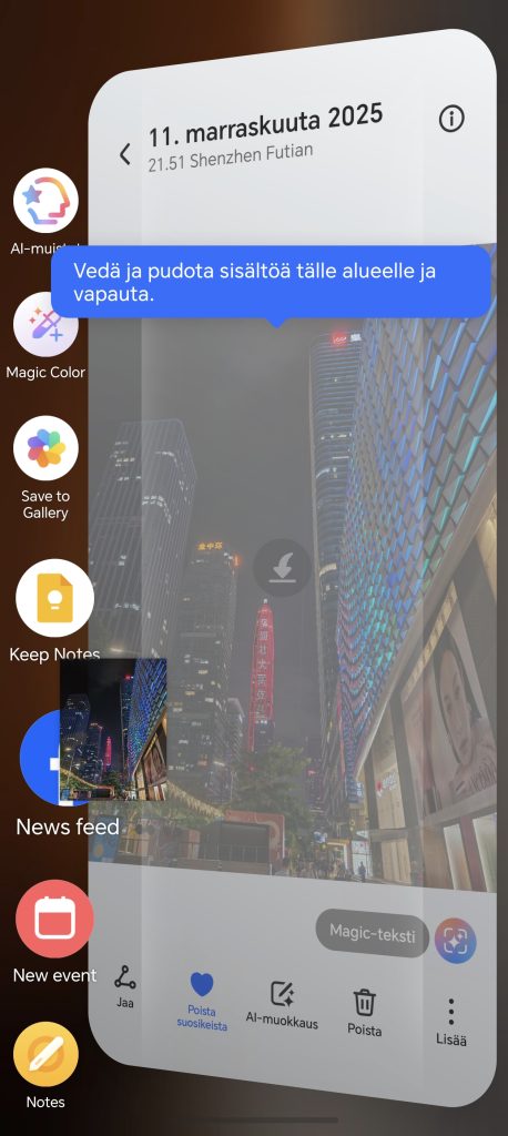 AI-kuvakaappaus on hyvä esimerkki. Kuvakaappaus ei ole enää vain kuva ruudusta, vaan siihen liittyy älyä. Heti kuvakaappauksen jälkeen saa sovellusehdotuksia ja nopean reitin seuraavaan askeleeseen. Tämä kuulostaa pieneltä, mutta käytännössä se on juuri sitä “askeleen edellä” -ajattelua. Kun ottaa kuvakaappauksen, se otetaan yleensä siksi, että kuvalla aikoo tehdä jotain.