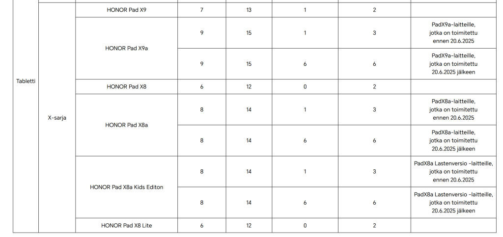 Honor ei ole erikseen selittänyt, miksi nimenomaan Pad X9a- ja X8a -mallien tuki jakautuu näin jyrkästi kahtia. Todennäköisin syy on, että EU-säädökset koskevat vain 20. kesäkuuta 2025 jälkeen EU-markkinoille toimitettavia yksiköitä, mikä jättää aiemmin myydyt laitteet vanhan lainsäädännön piiriin. Käytännössä tämä tarkoittaa, että vanhoja yksiköitä ei tarvitse juridisesti päivittää uuteen päivityslupaukseen, vaikka ne olisivat muuten identtisiä.