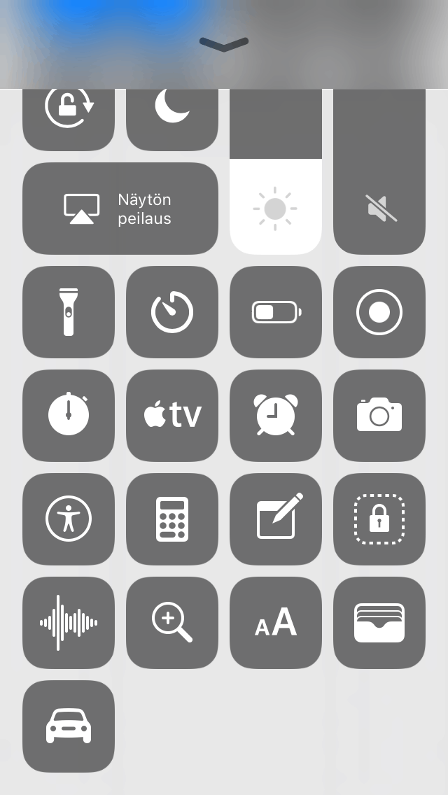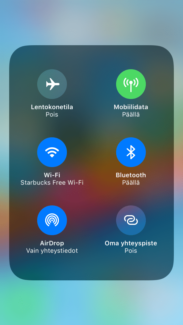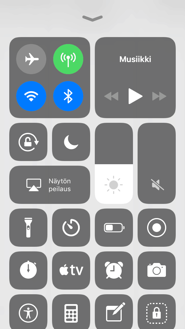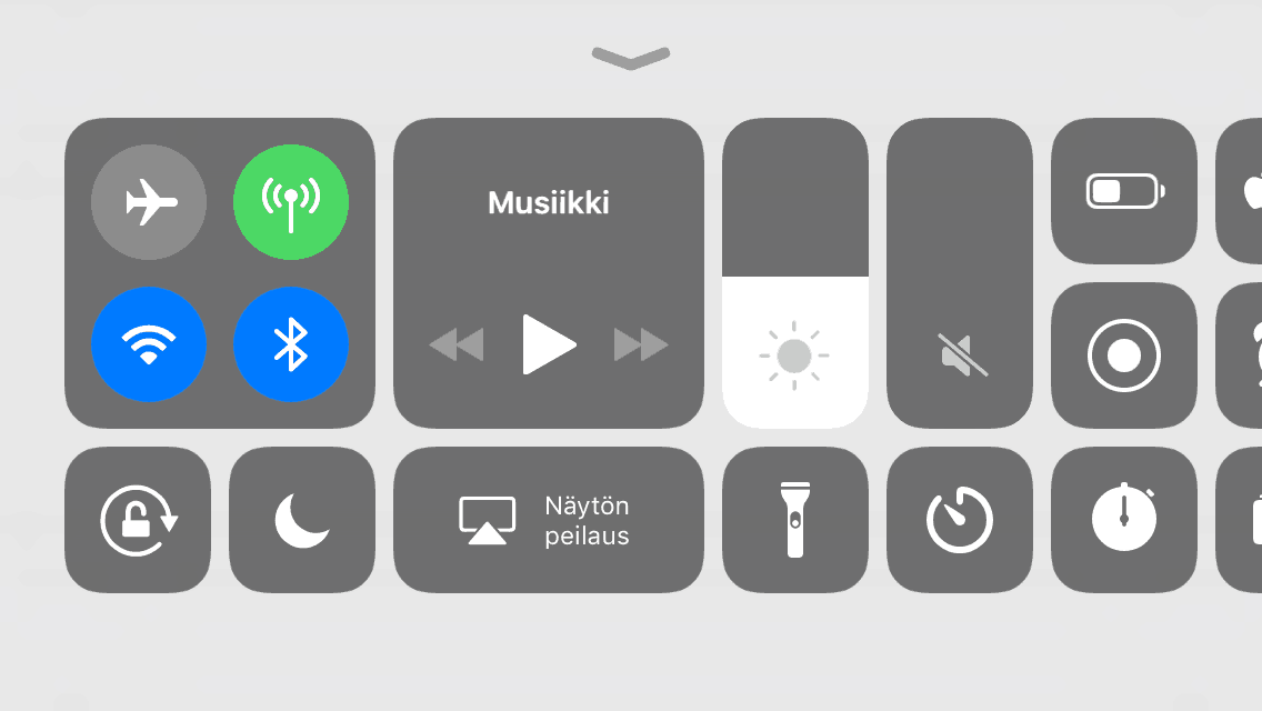 Ohjauskeskuksesta löytyy tietenkin vanhaan tapaan pikakuvakkeet myös yhteyksille, ja kun niitä painaa kovempaa (iPhone 6s tai uudempi) tai pohjassa, valintoja ponnahtaakin näytölle enemmän. Kovempaa tai pohjassa painaminen toimii myös lähes kaikissa Ohjauskeskuksen säätimissä ja pikakuvakkeissa, esimerkiksi taskulampun voimakkuutta voi nyt säätää myös laitteissa, joissa ei ole paineherkkää näyttöä.